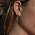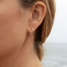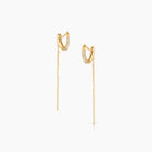 Description: Joining our threader earring collection is Lila. This pavé hoop lined with cubic zirconias adds a little something extra with a gold post and chain that threads through the hoop and dangles from the back.