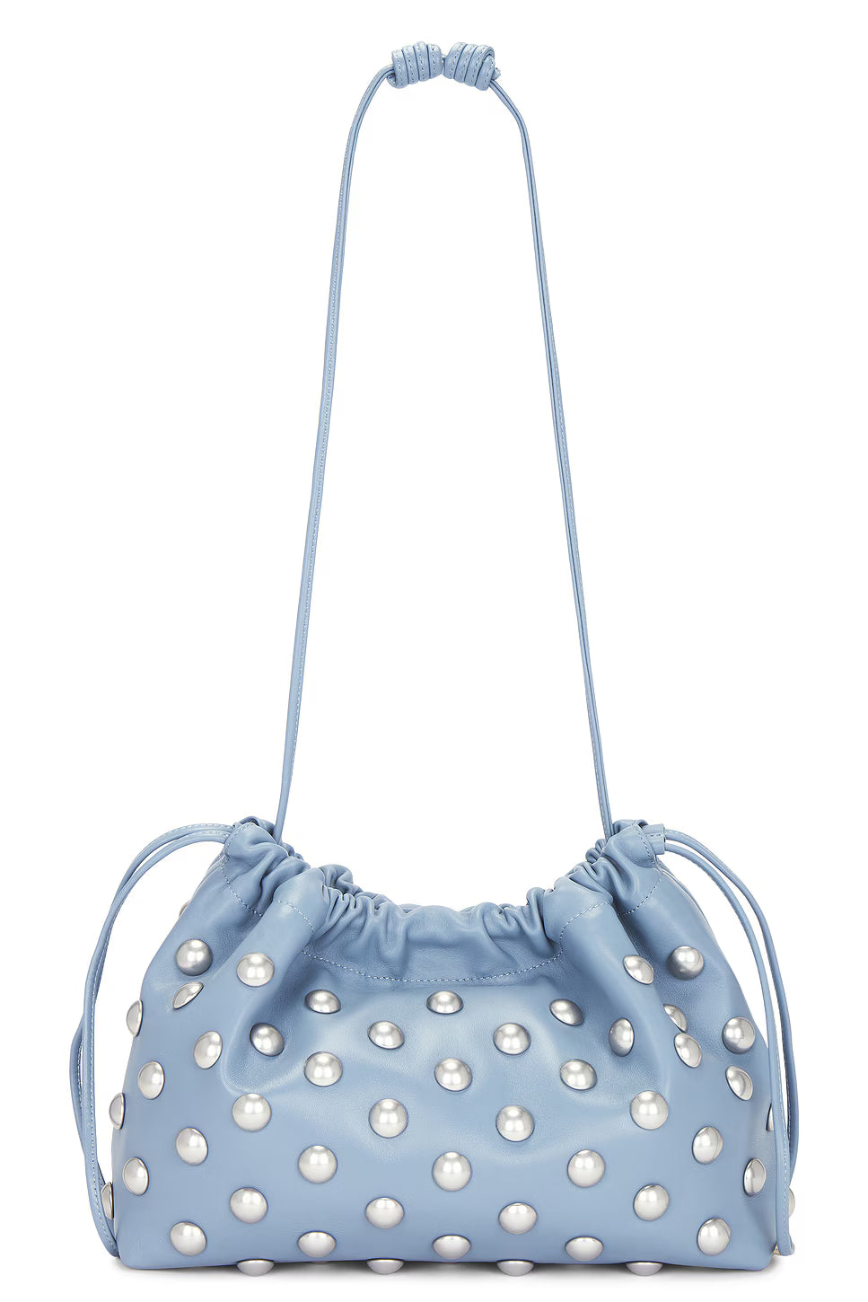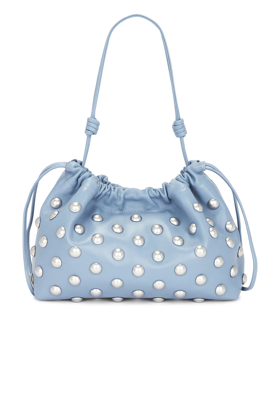 • Softly ruched top silhouette with silver-tone stud accents