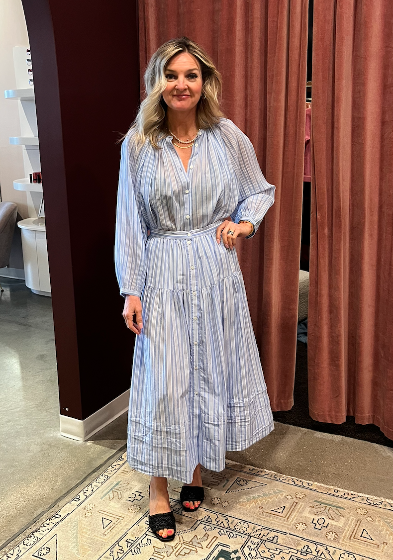 Inspired by our best-selling Sebastiane Skirt, the Marceline features a full, tiered silhouette, finished with a row of mother-of-pearl buttons down the center front. Cut from washed organic cotton for a lived-in softness, it’s rendered in our nostalgic yarn-dyed Salerno Stripe.