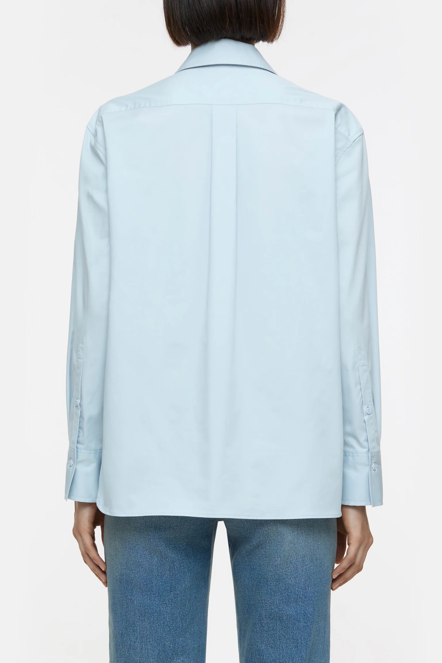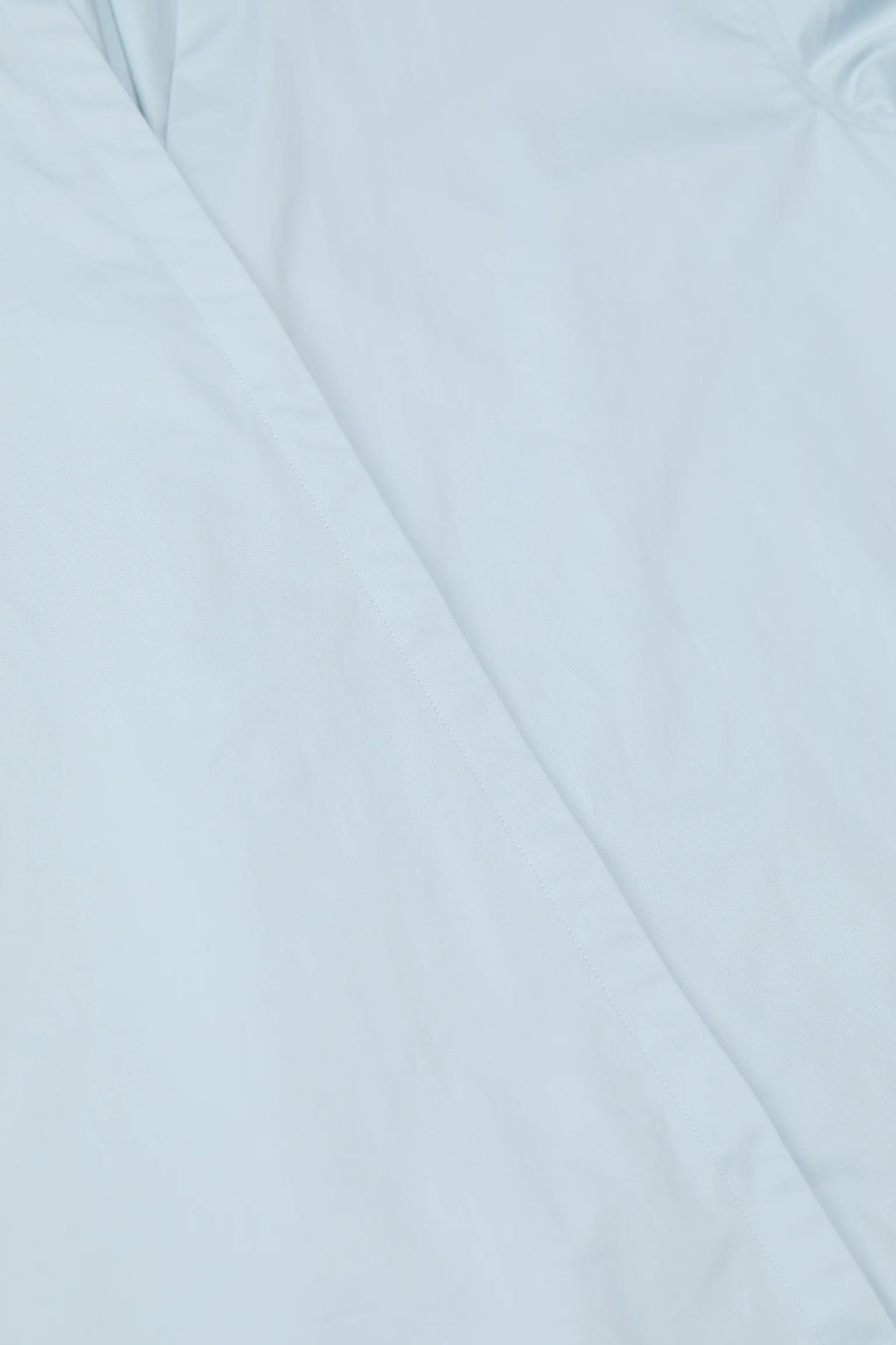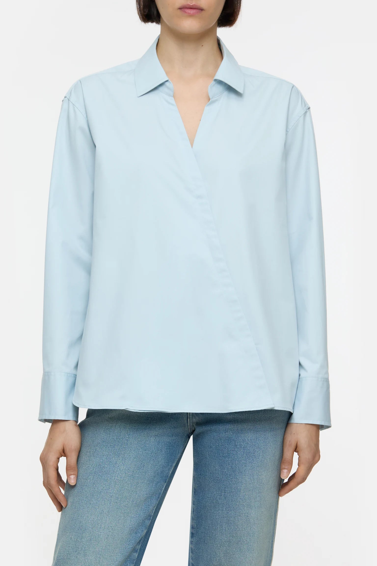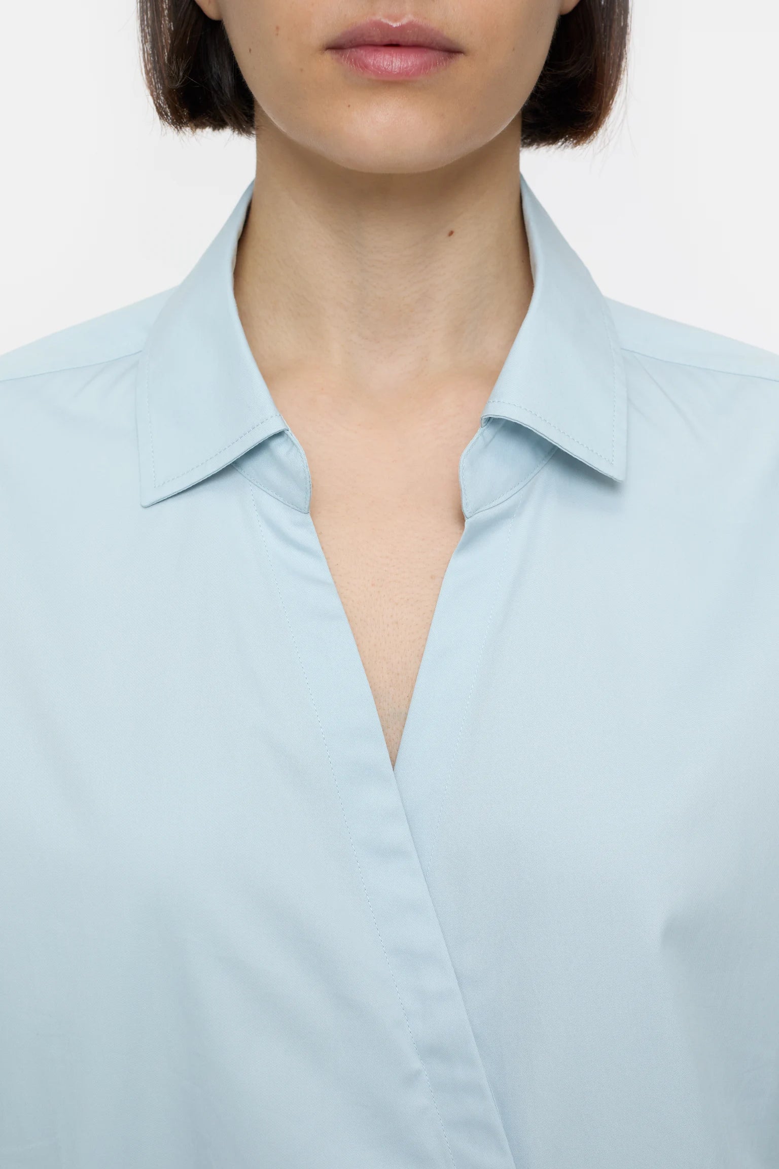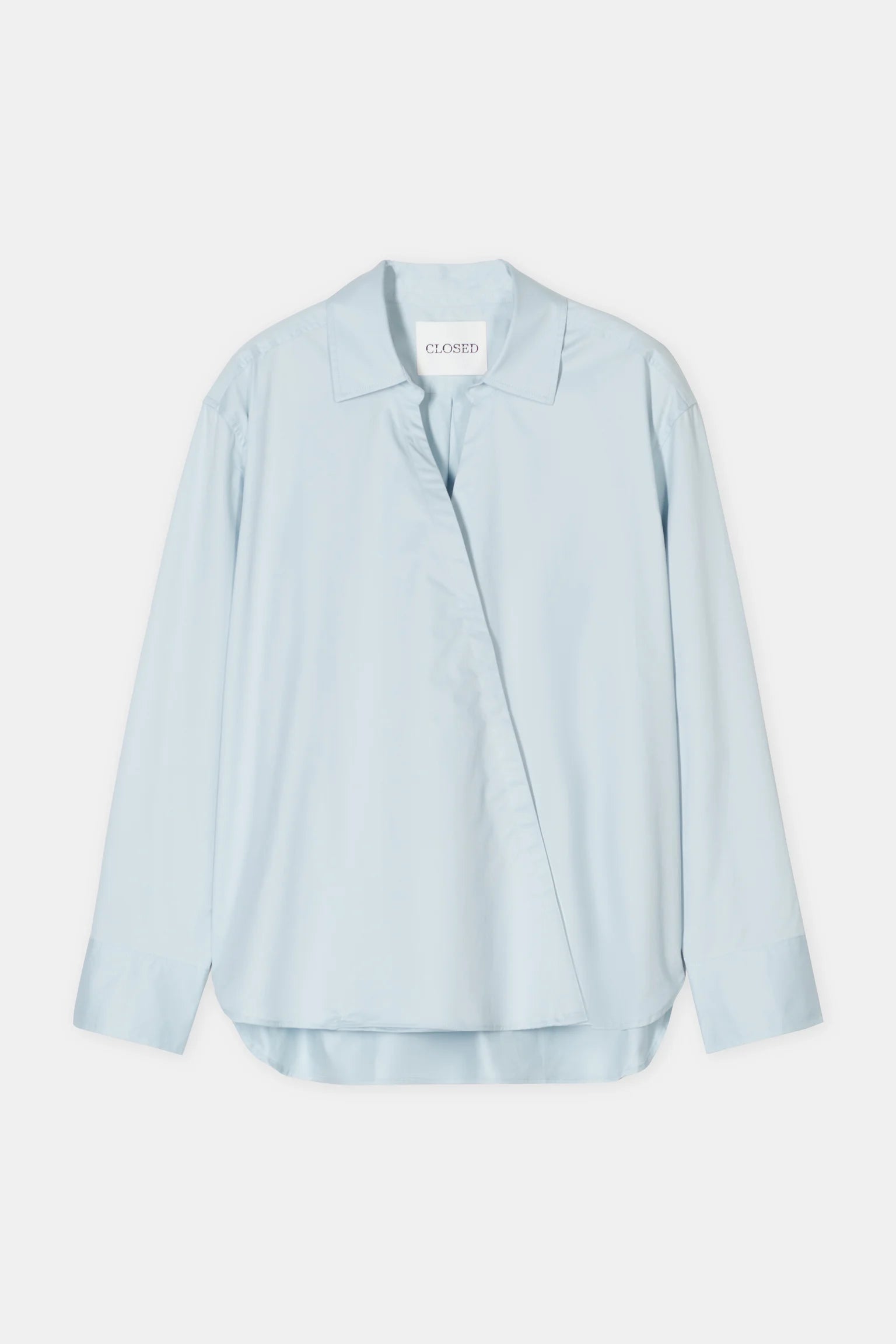 Our blouse made of sturdy cotton poplin with a dry, paper-like feel and clean look. It has an asymmetric design detail and comes with a classic shirt collar, cuffs and a rounded hemline.