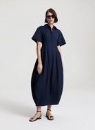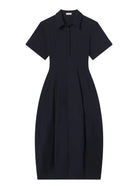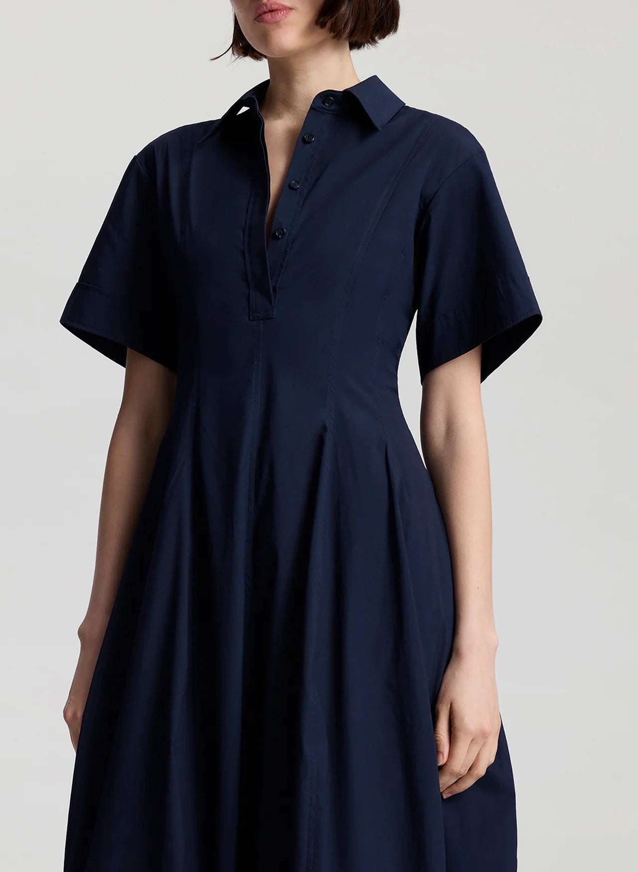 The Della Dress is crafted from crisp pima stretch poplin in a deep evening blue. This short-sleeve shirtdress silhouette features a sharp collar, buttoned placket, and sculptural volume through the midi-length skirt—tempered by vertical seams and discreet side pockets. The seamed waist accentuates the waist, creating a clean, sculpted fit.