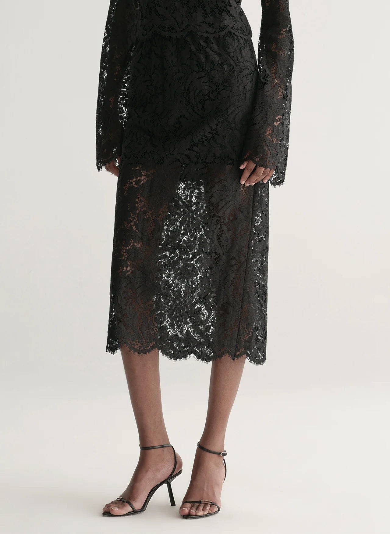 The Lydia Skirt is classic lace reinterpreted in a column silhouette. Cut from archival French lace with a botanical-inspired pattern, this midi-length sheath layers over a built-in mini slip for a streamlined, contemporary shape. Finished with scalloped edges, it’s a polished yet romantic piece for holiday evenings, cocktails, or special occasions.