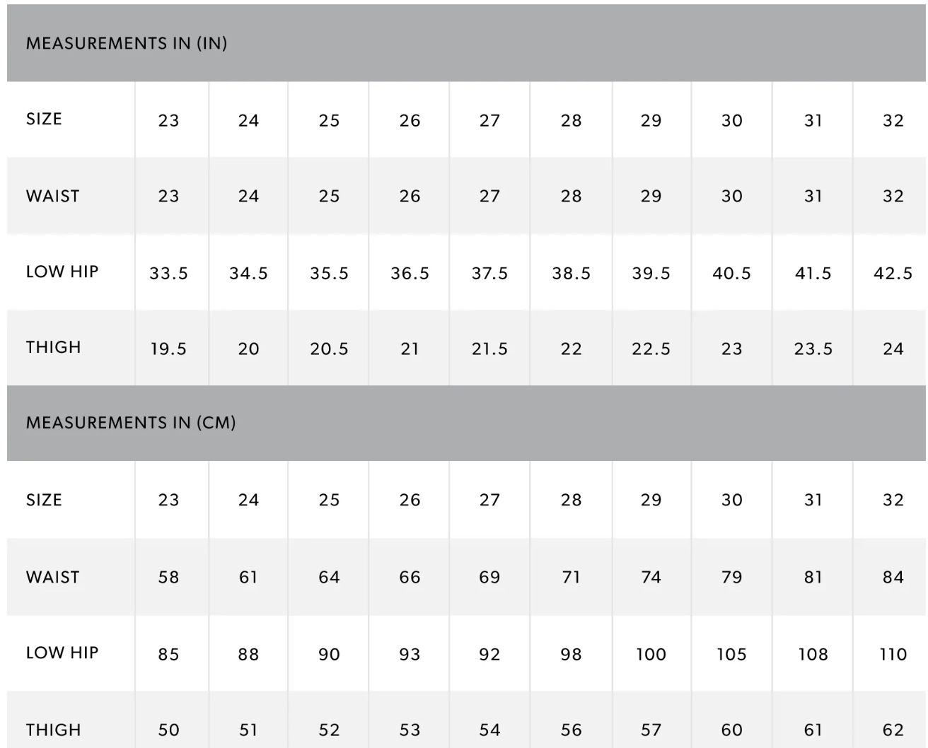 • Product Measurements (Size 27): Inseam: 28.3", Rise: 12", Waist: 31", Hip: 43", Leg Opening: 17.3"