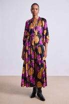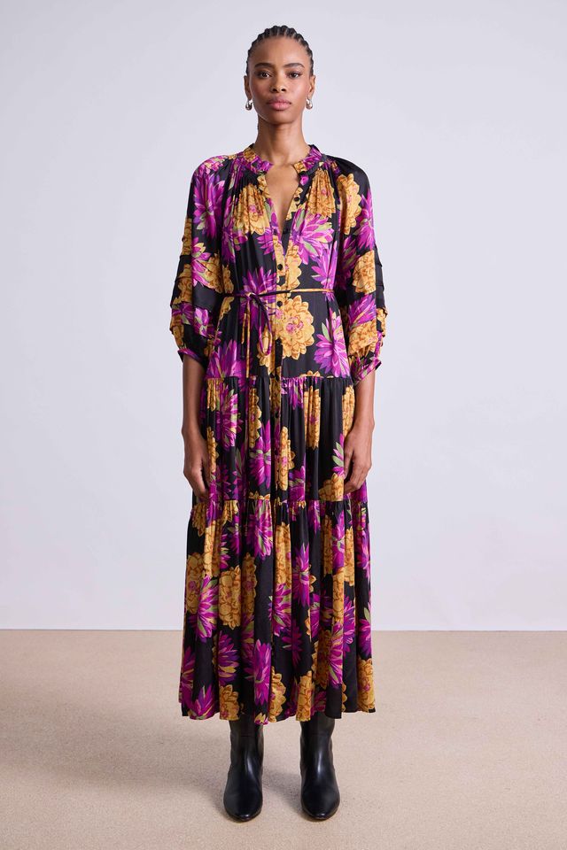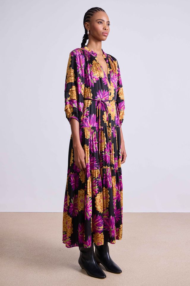 - A staple maxi silhouette, complete with a voluminous tiered skirt, neck ruffle and subtle pleat detailing on the sleeve