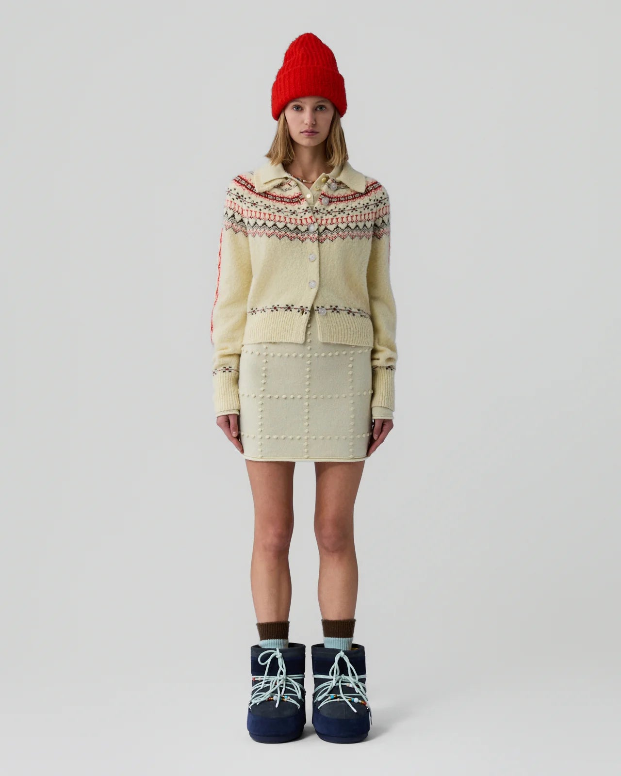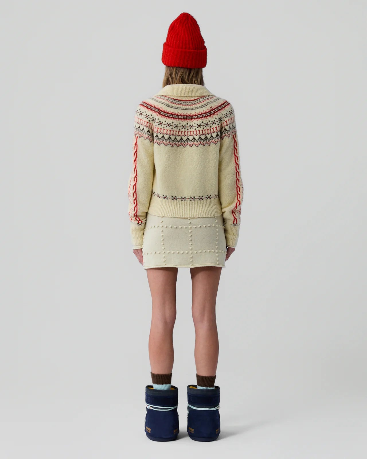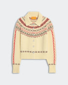 The Cloud Chalet Cardigan is a women’s Fair Isle cashmere cardigan crafted from a wool–cashmere blend and plush Cloud yarn. Designed with a relaxed, shrunken fit, it offers cozy warmth and timeless pattern — perfect for layering through the colder months.
