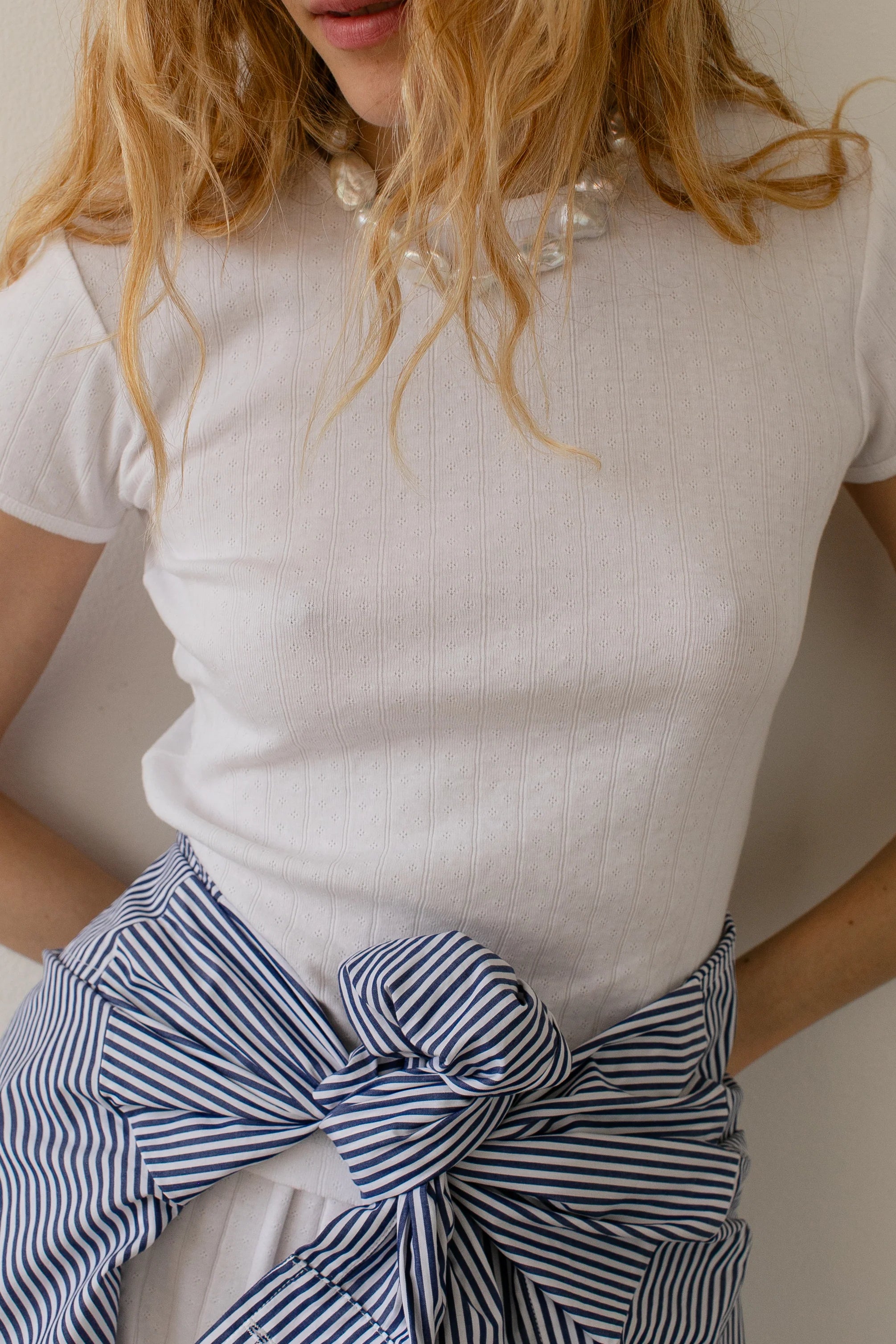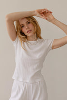 - The Pointelle Baby Tee is crafted with 100% Organic Cotton, featuring a slim-fit, crewneck, and cap sleeves.