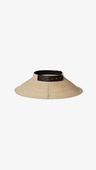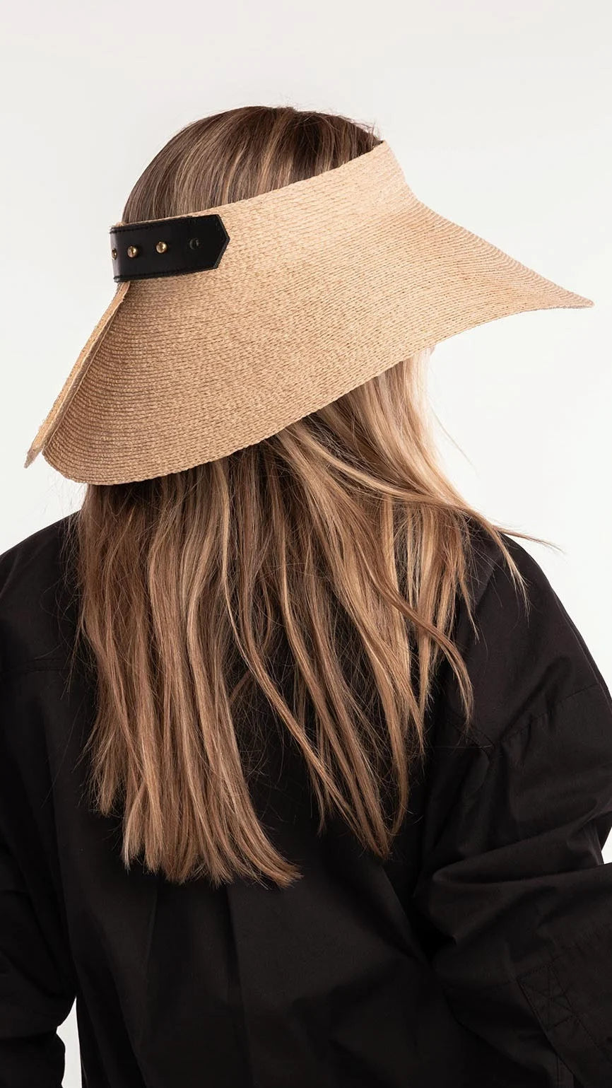 Birdie is an adjustable visor crafted from raffia straw, finished with a regenerative leather closure. This visor can be rolled up for ease of packing.