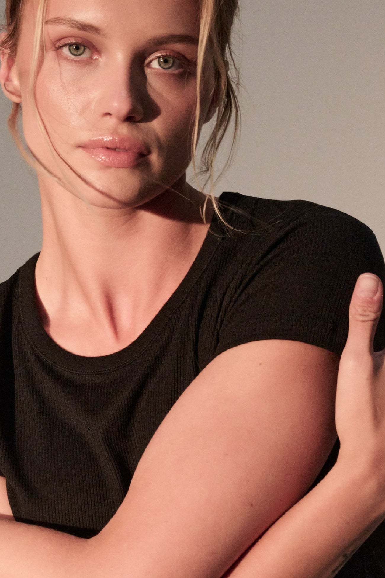 This lyocell cotton baby rib short sleeve crewneck t-shirt features a luxurious second-skin fit. Fluid and comfortable, this tee is knitted in a unique mix of lyocell and cotton. The lyocell, also called 'vegetable silk' is an eco-friendly fabric made from wood. The fabric is resistant, lightweight, and soft. Trendy and iconic, this ribbed tee will follow you through the season.