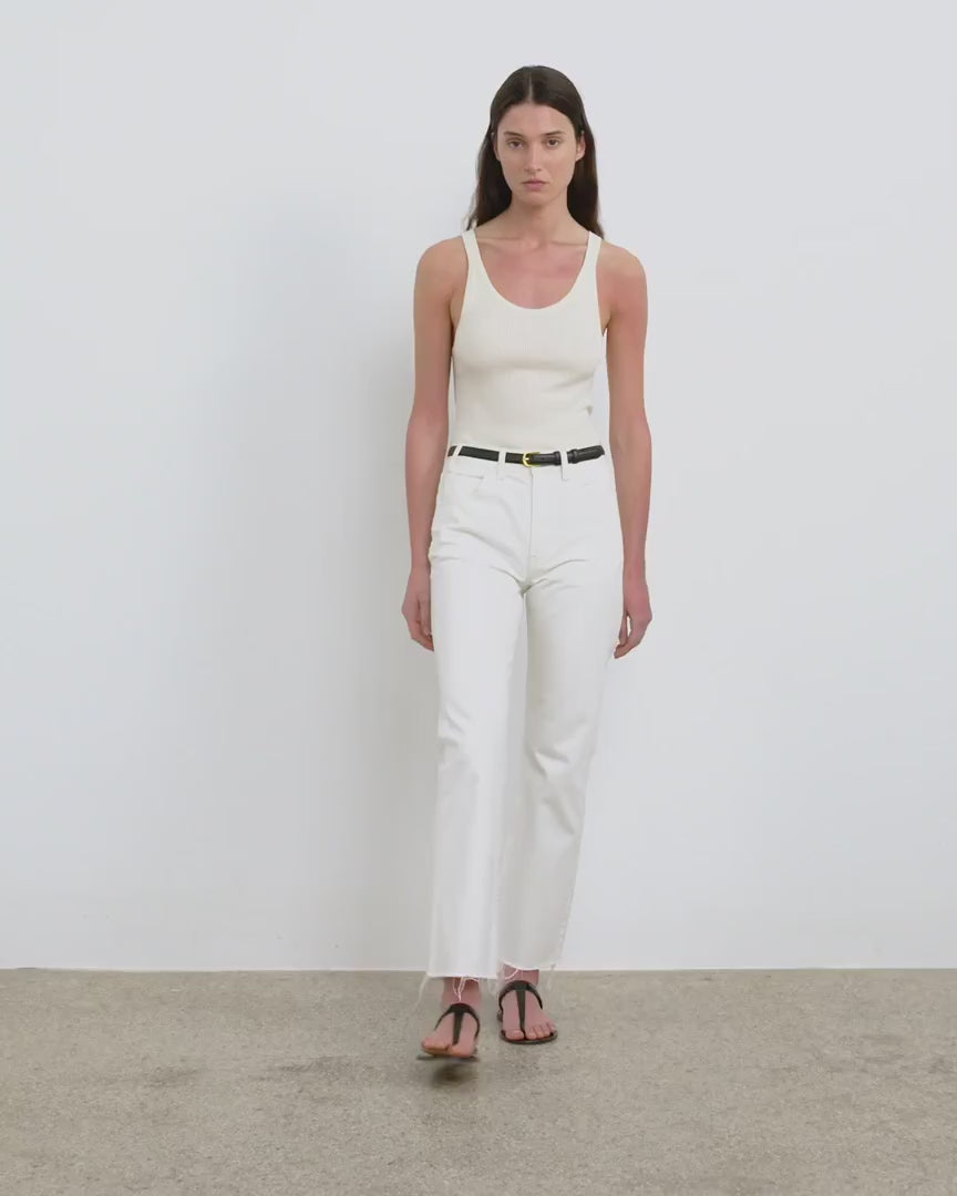 High-rise slim straight cropped jean in Japanese non-stretch heavyweight crosshatch denim. Fitted through waist and hips. Five pocket details. Zip fly. Shank closure. Belt loops. Raw hem.