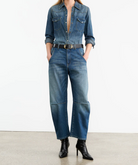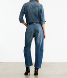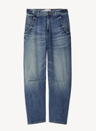 Mid-rise, relaxed fit barrel leg jean in Japanese stretch denim. Uniquely curved silhouette. Seam at knees. Gusset at inseam. Zip fly. Shank closure. Front slash pockets. Top-stitched back patch pockets. Belt loops.