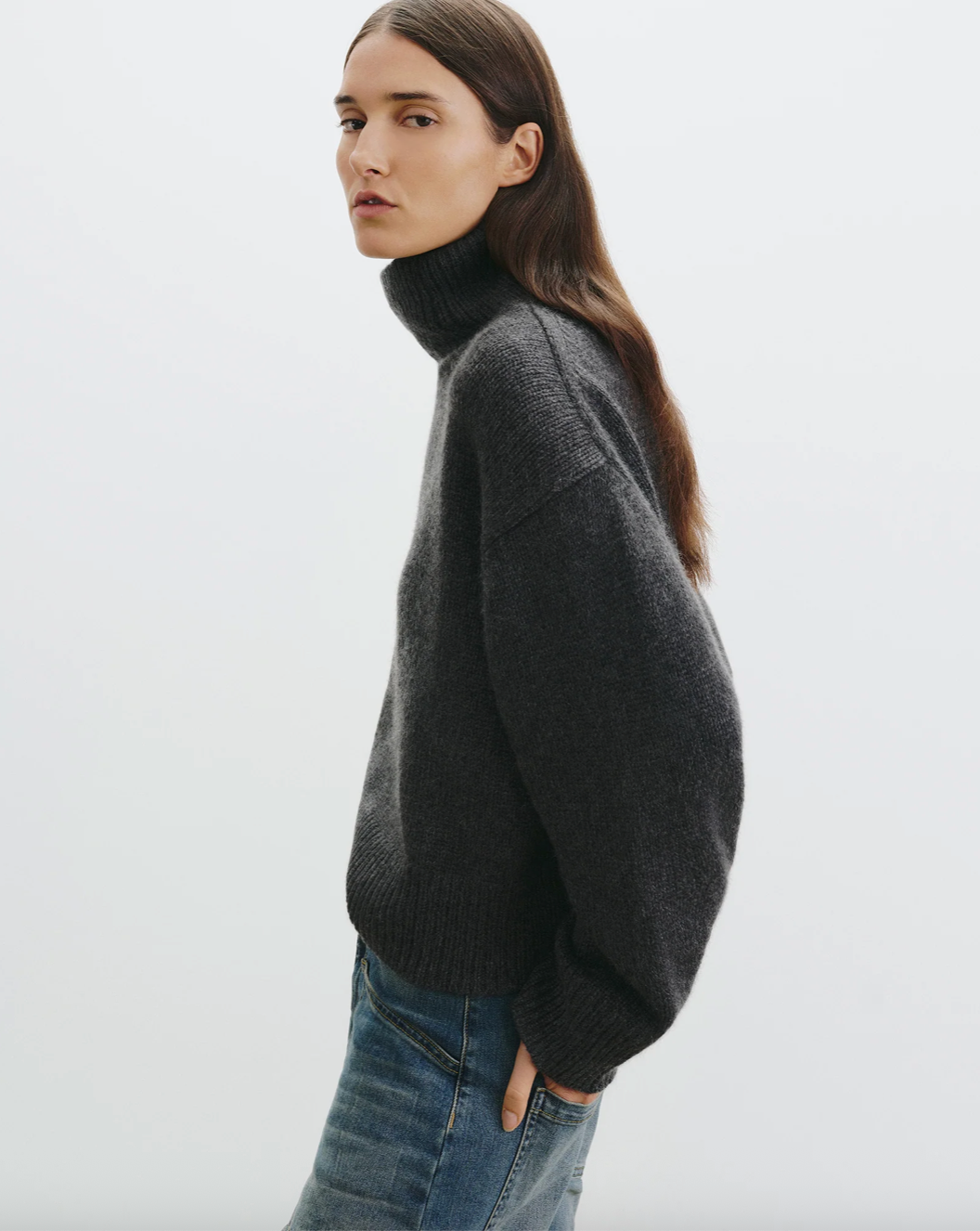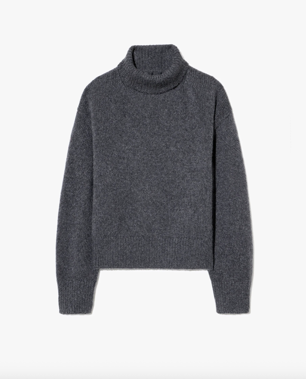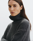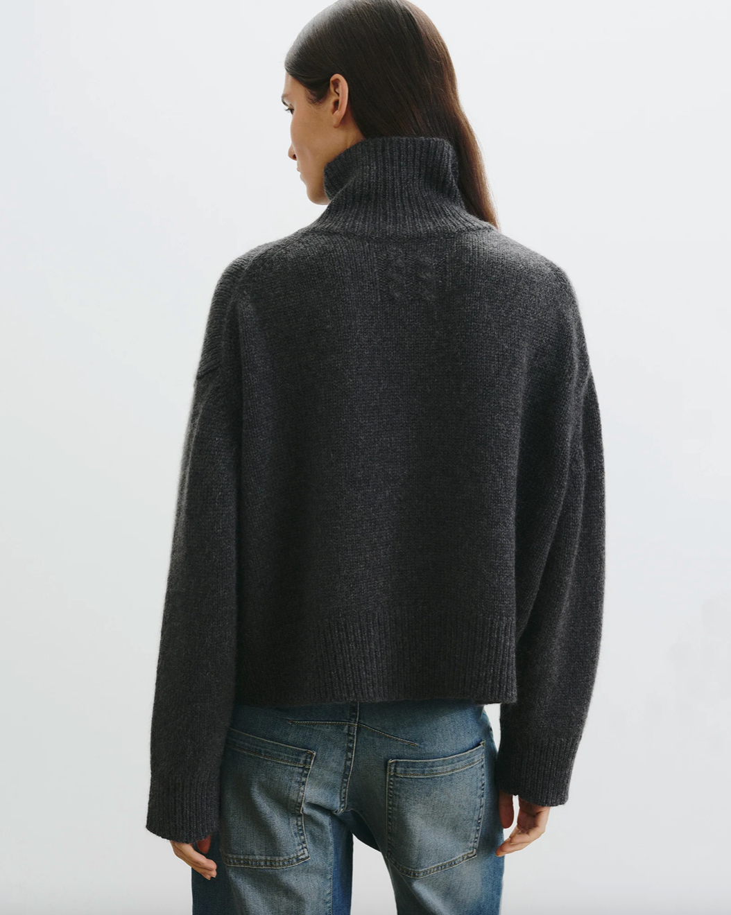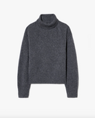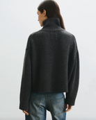 Chunky weight boxy turtleneck in Italian cashmere. High neck designed to be worn up, but easily able to fold over. Dropped shoulder. Rib start at hem and sleeve. Fashioning along arm hole. Signature center back cable knit detail.