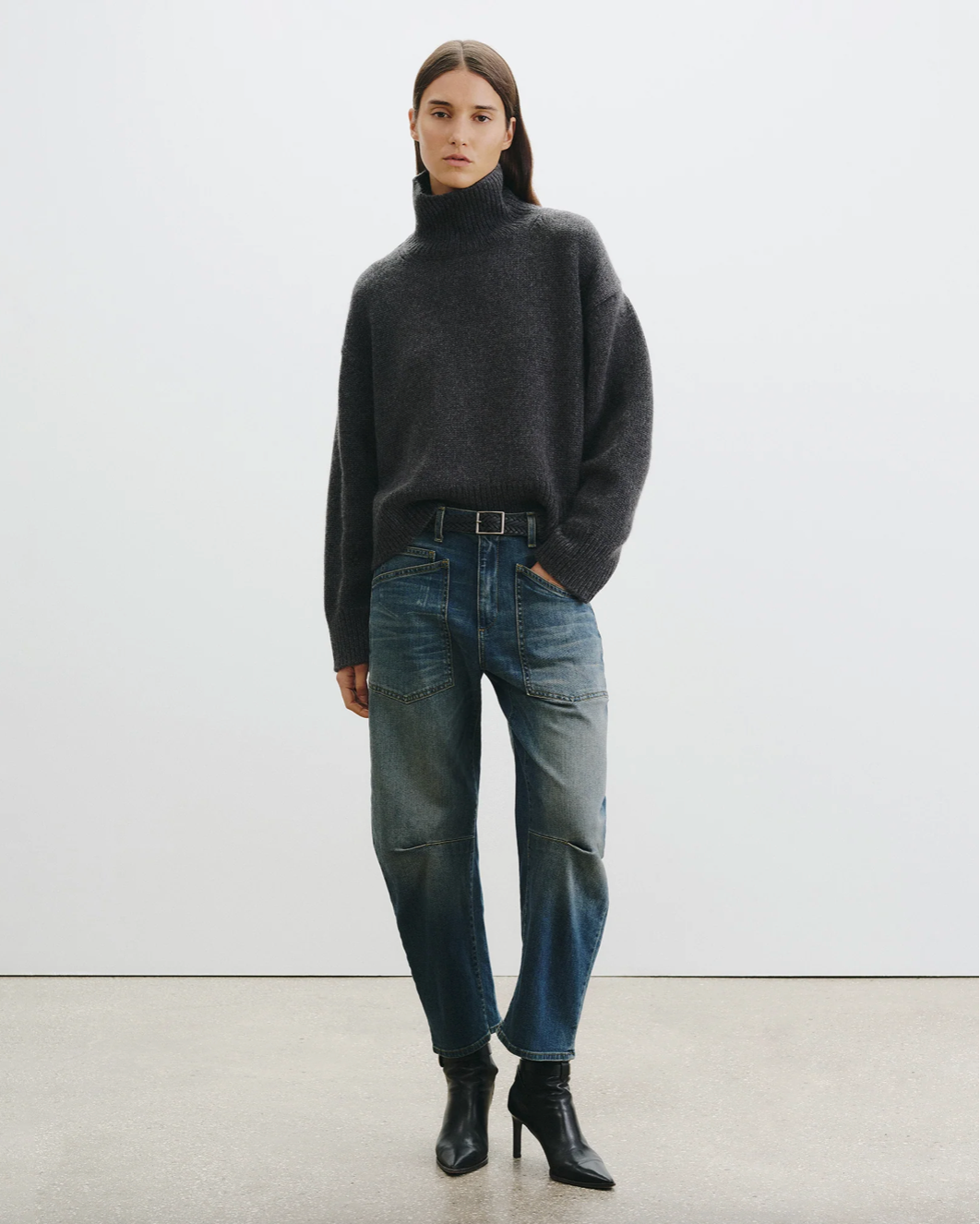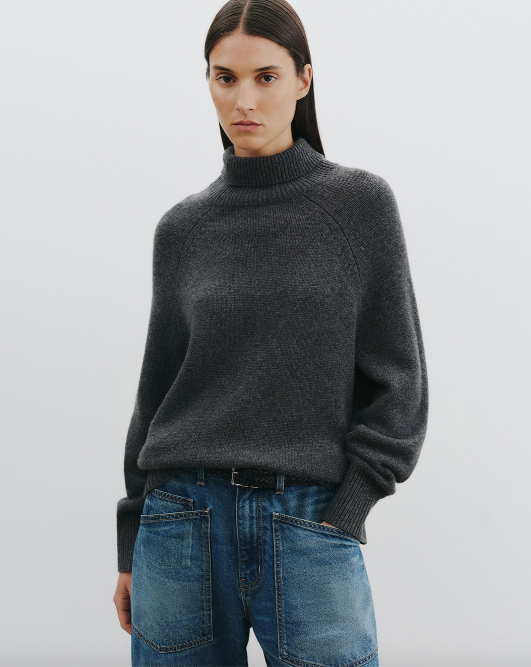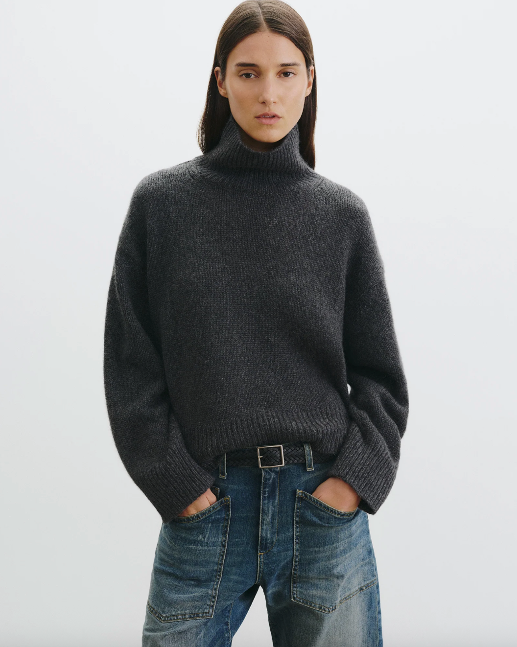 Chunky weight boxy turtleneck in Italian cashmere. High neck designed to be worn up, but easily able to fold over. Dropped shoulder. Rib start at hem and sleeve. Fashioning along arm hole. Signature center back cable knit detail.