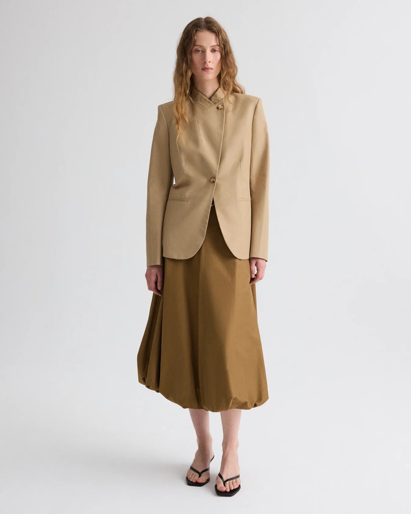 Voluminous midi skirt in water-repellent twill. Fabric is a durable cotton–nylon gabardine that is stain-proof and water-repellent. The Full Intentions Skirt is designed with a sculptural A-line shape that collapses into a softly bubbled hem. Fitted at the waist with subtle front seaming for structure. Finished with side pockets and a concealed zip closure.