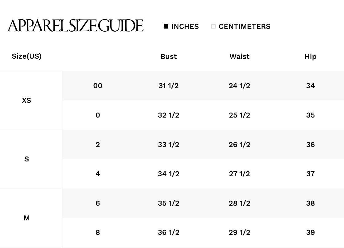 - Model is 5'10'' with 32.5'' bust / 34.5'' hips.