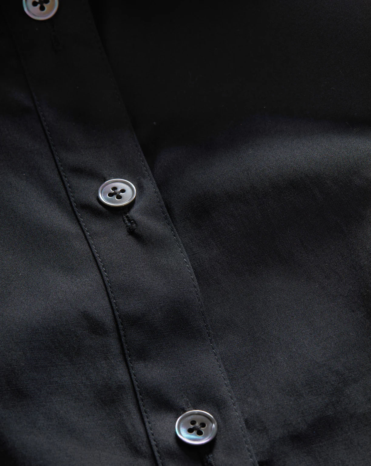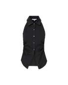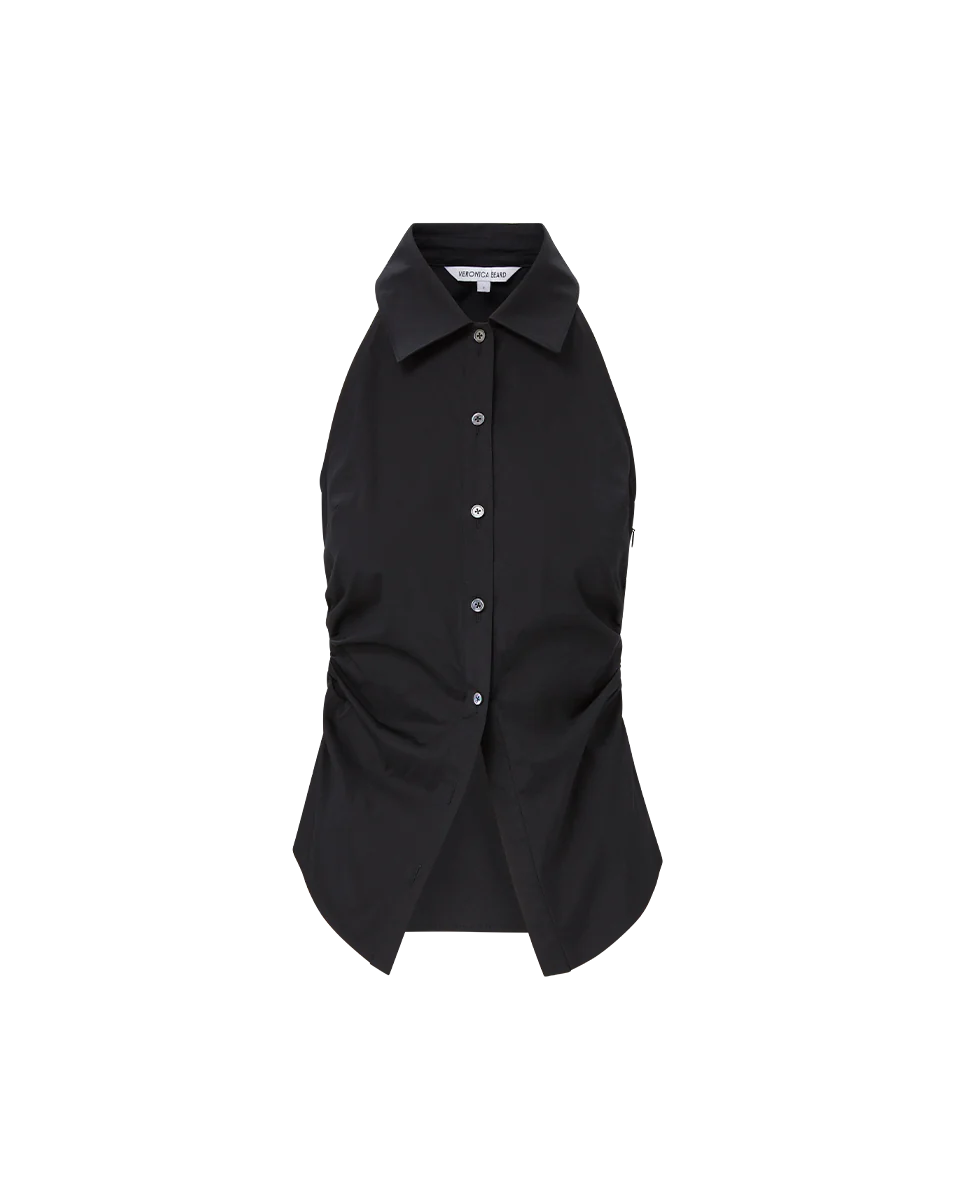 As essential, elevated. We reimagined the classic white black button-down in a sleeveless silhouette and added an exaggerated angled cutaway hem. Wear it alone or as a layering essential—this will be your new wear-anywhere go-to.