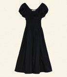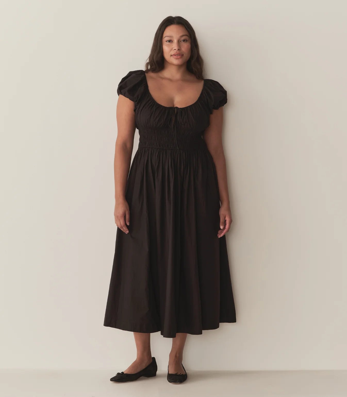 In crisp 100% organic cotton poplin, the Quinn Dress—a Favorite Character— features a scoop neckline with an adjustable tie and a playful keyhole detail, a gathered bust, and short puffed sleeves. A fitted bodice with elasticized smocking gives way to a midi-length A-line skirt.