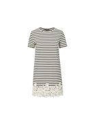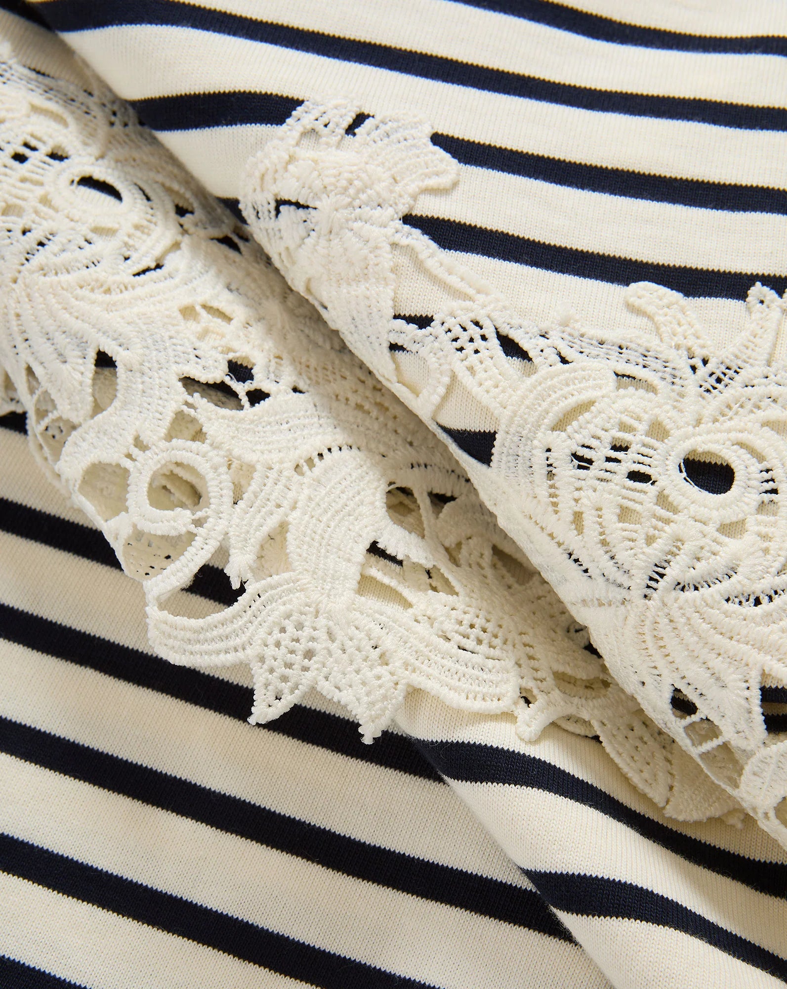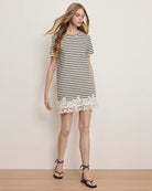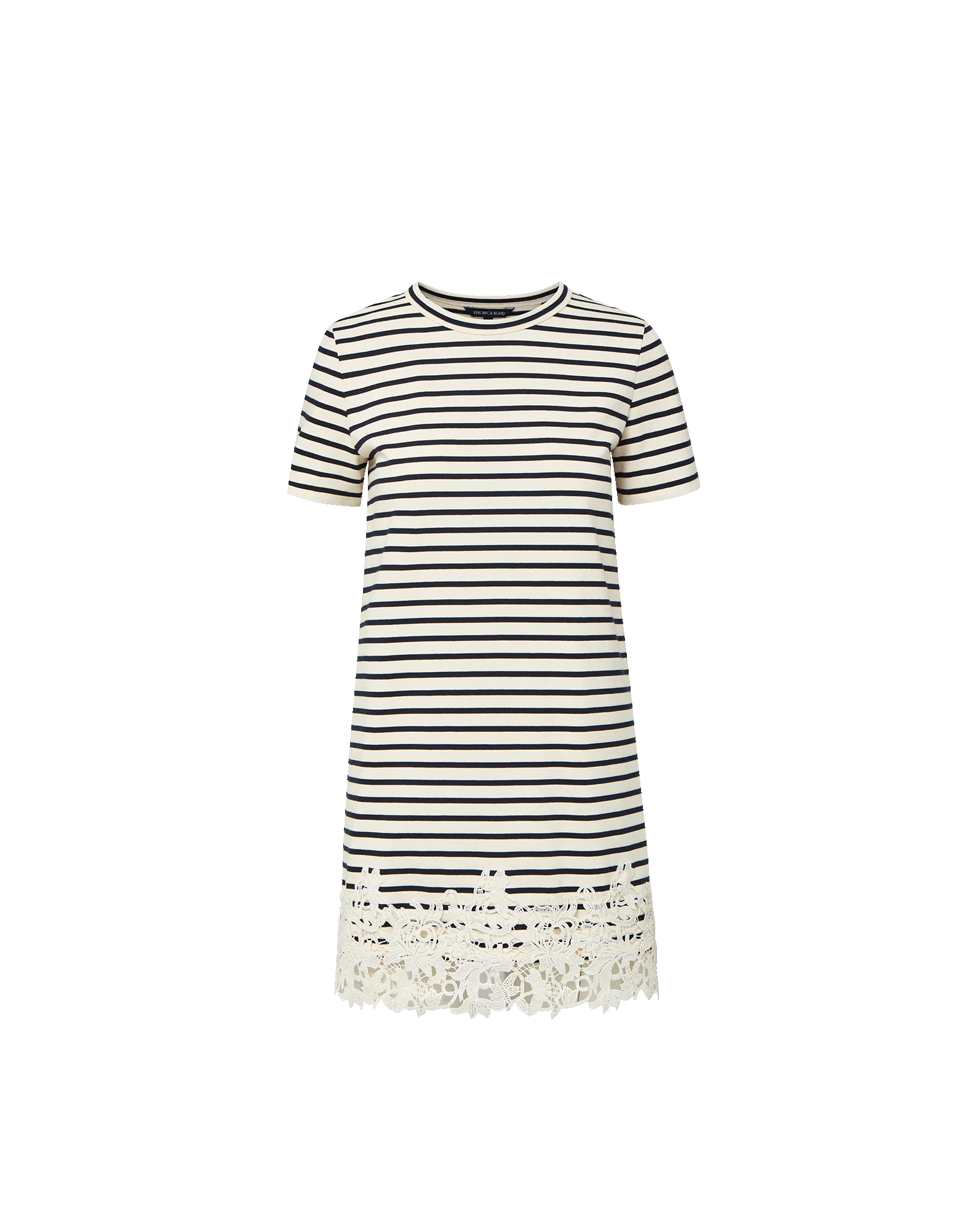 A feminine take on nautical stripes. Made from soft cotton jersey, the navy-and-white Rhue mini dress features a relaxed fit, a crew neckline, short sleeves, and a band of floral lace at the hem. The clean, casual shift silhouette keeps it versatile and wearable while the embellishment adds interest without excess. Pair this striped T-shirt dress with sandals and shades—it's great for weekends, getaways and beach days.