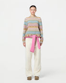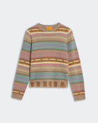 This western stripe crew neck sweater is crafted in a wool–cashmere blend with textured jacquard stripes, ribbed trims, and fringe hem detail. A mid-weight striped cashmere sweater designed for layering and everyday wear.