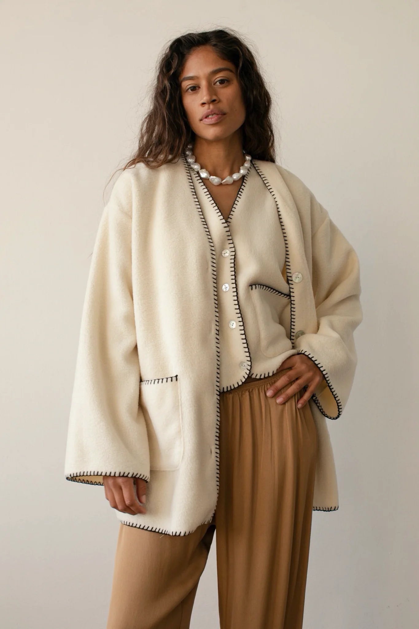 The Polar Fleece Stitch Jacket is crafted with our ultra-cozy Polar Fleece fabric, featuring mother of pearl buttons, stitch detailing and front pockets.
