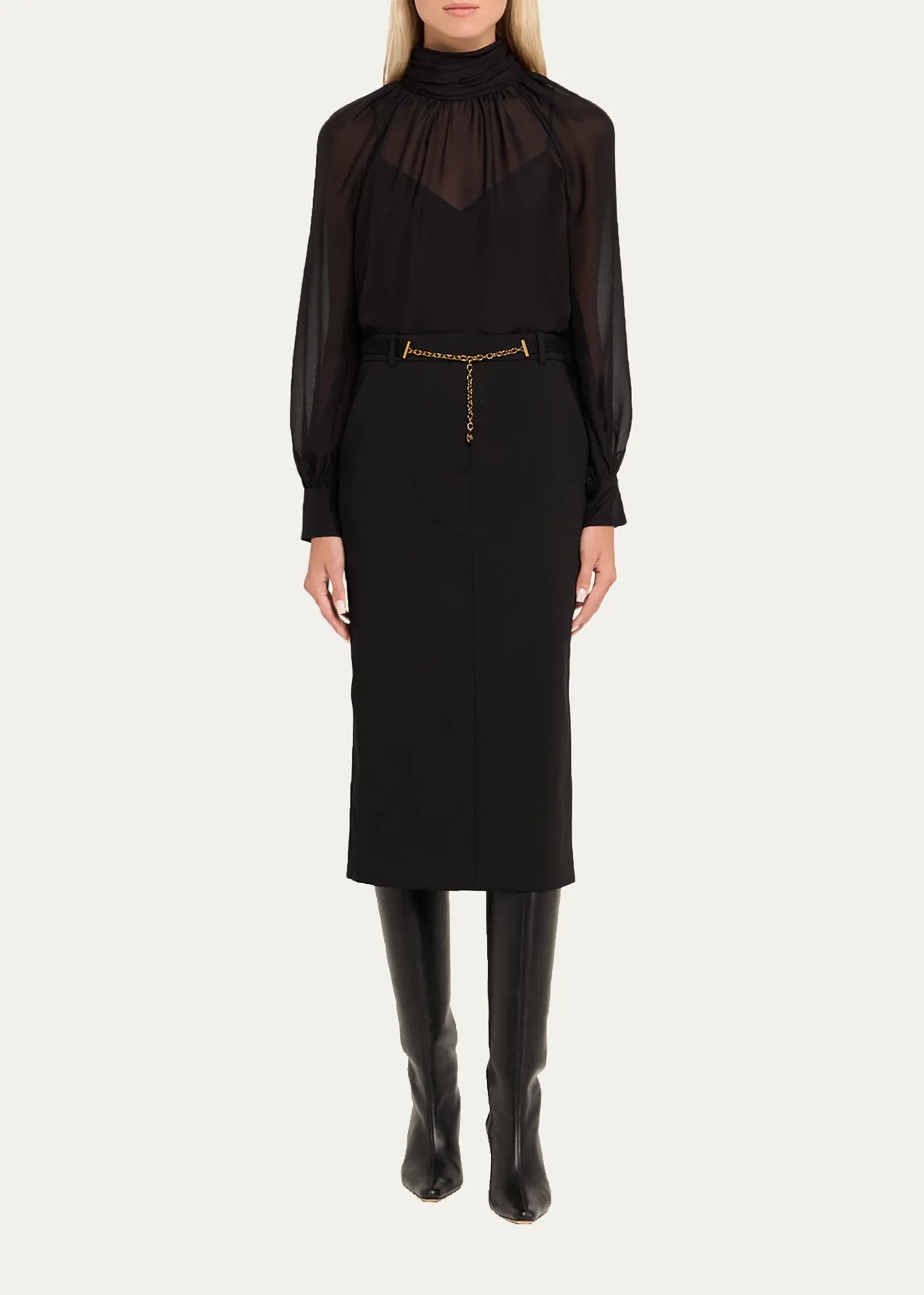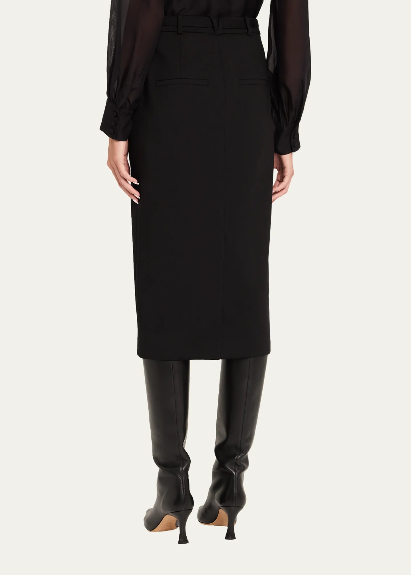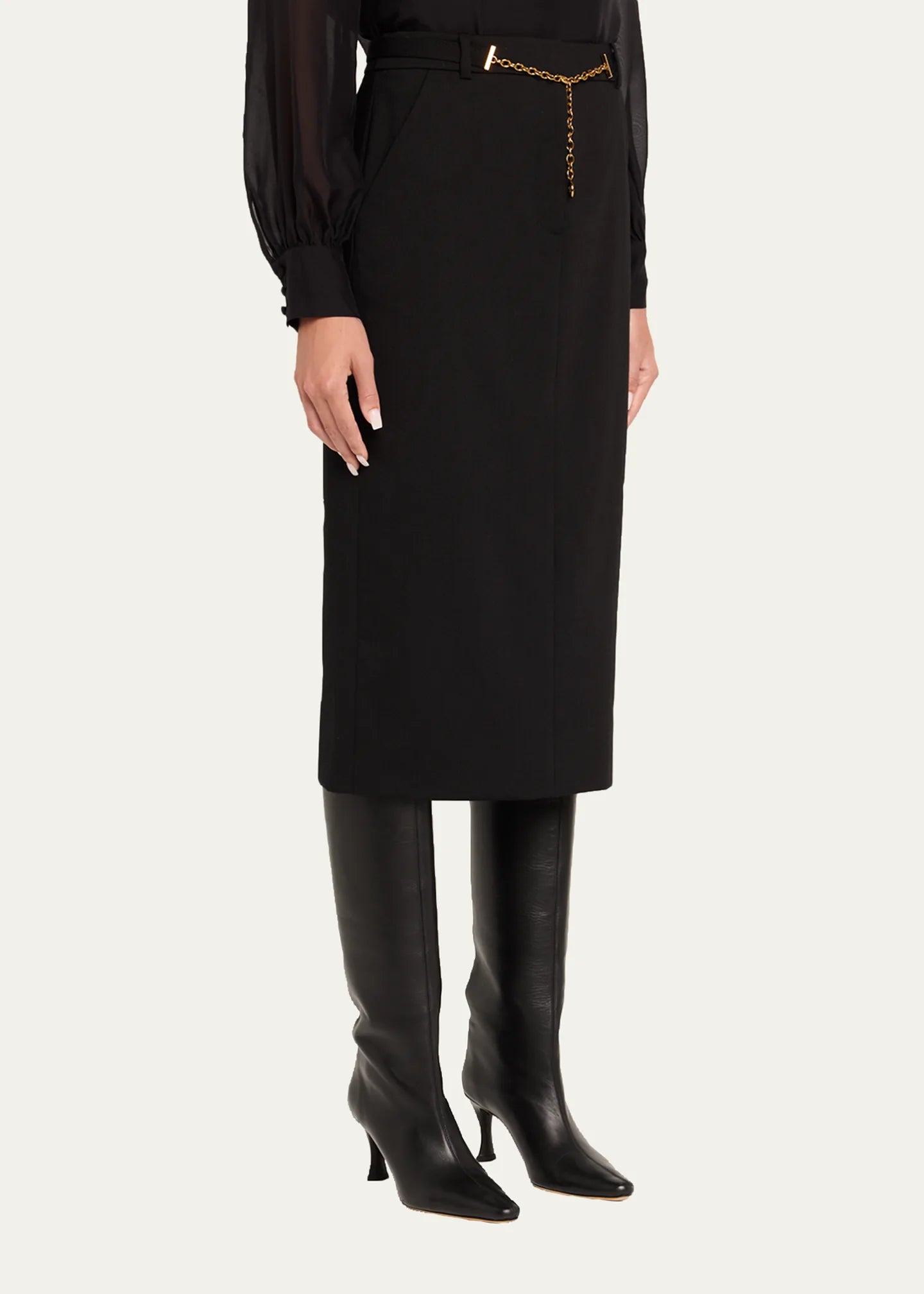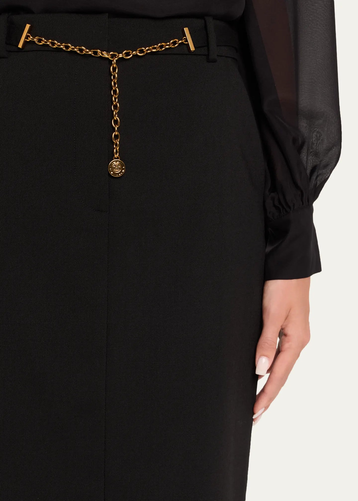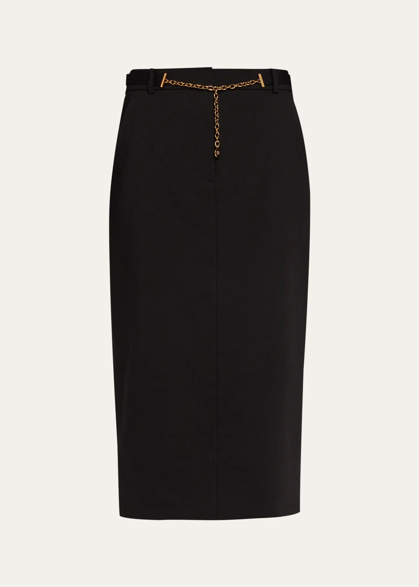 Adorned with a sophisticated chain belt, the "Hoffman" pencil skirt by Veronica Beard is crafted from premium stretch wool suiting for a polished, yet comfortable look.