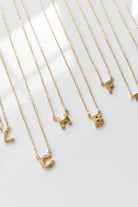 14k gold plated tiny letter charm on 14" gold filled chain with a 2" extender.