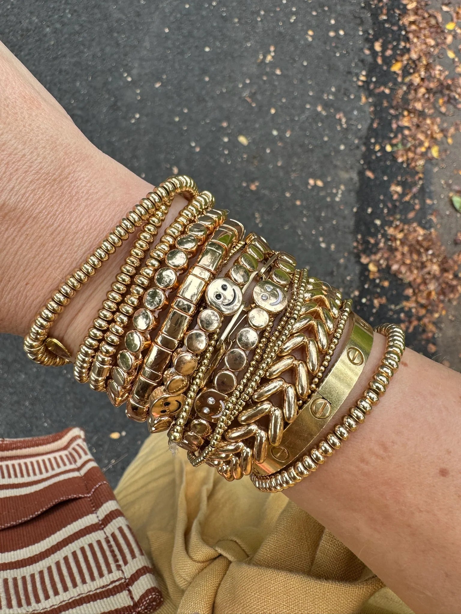 Our Golden Slimmed Single Bracelet is a staple to any stack, consisting of all gold rounded enamel tile alternating size beads. Part of our Fall Collection, this bracelet is 7.25" in length, and is a slip-on-style. All of our single bracelets are designed to be stacked or they can be styled to wear alone.