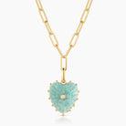 Description: Your favorite hand-carved heart just got a gemstone upgrade - amazonite. This super adjustable paperclip chain is elevated to new heights with our removable Malene heart pendant in the cool blue-green shades of amazonite. Carved stone, cubic zirconia, and high-shine gold. Everything you want and need in a statement necklace.