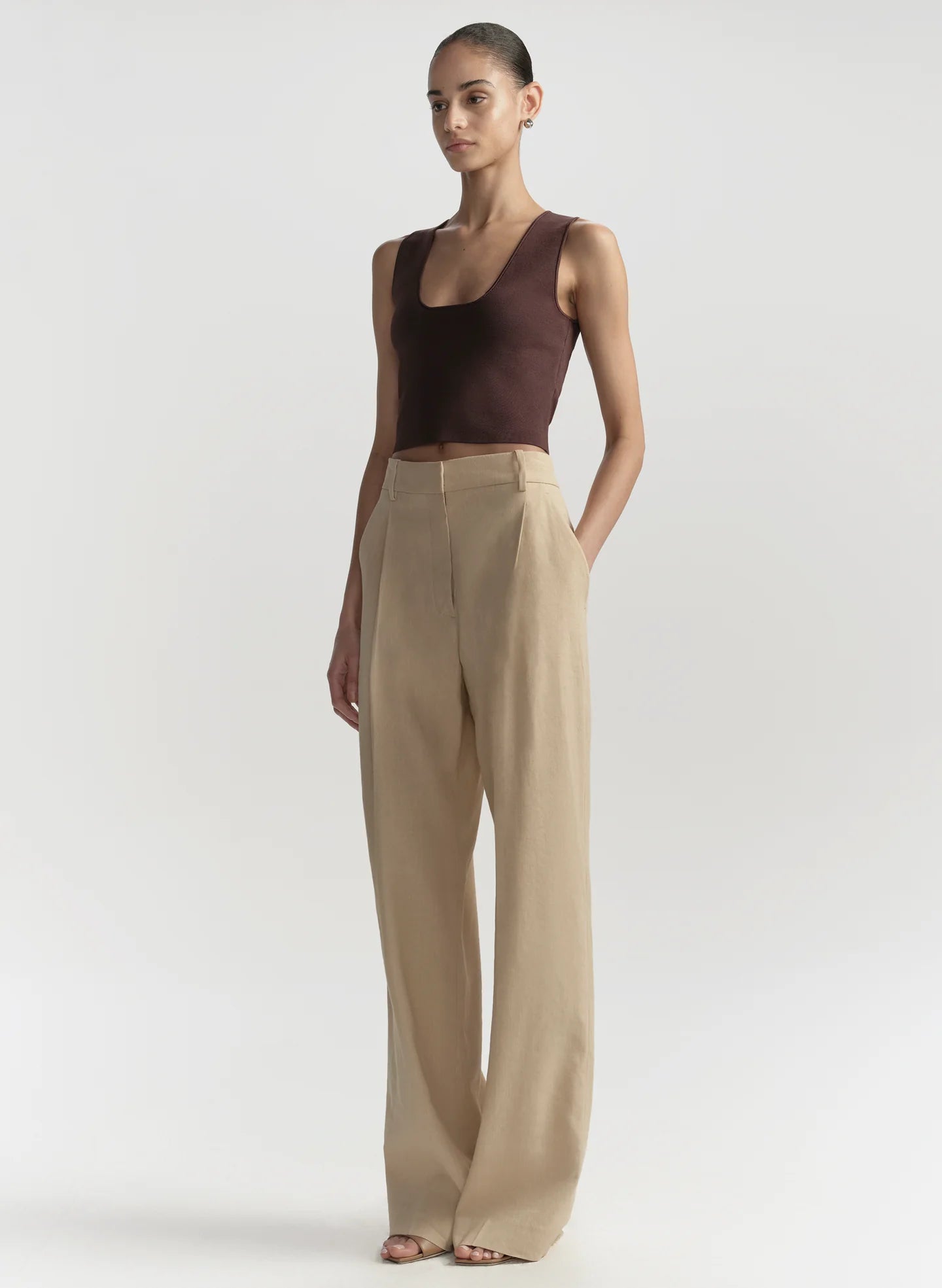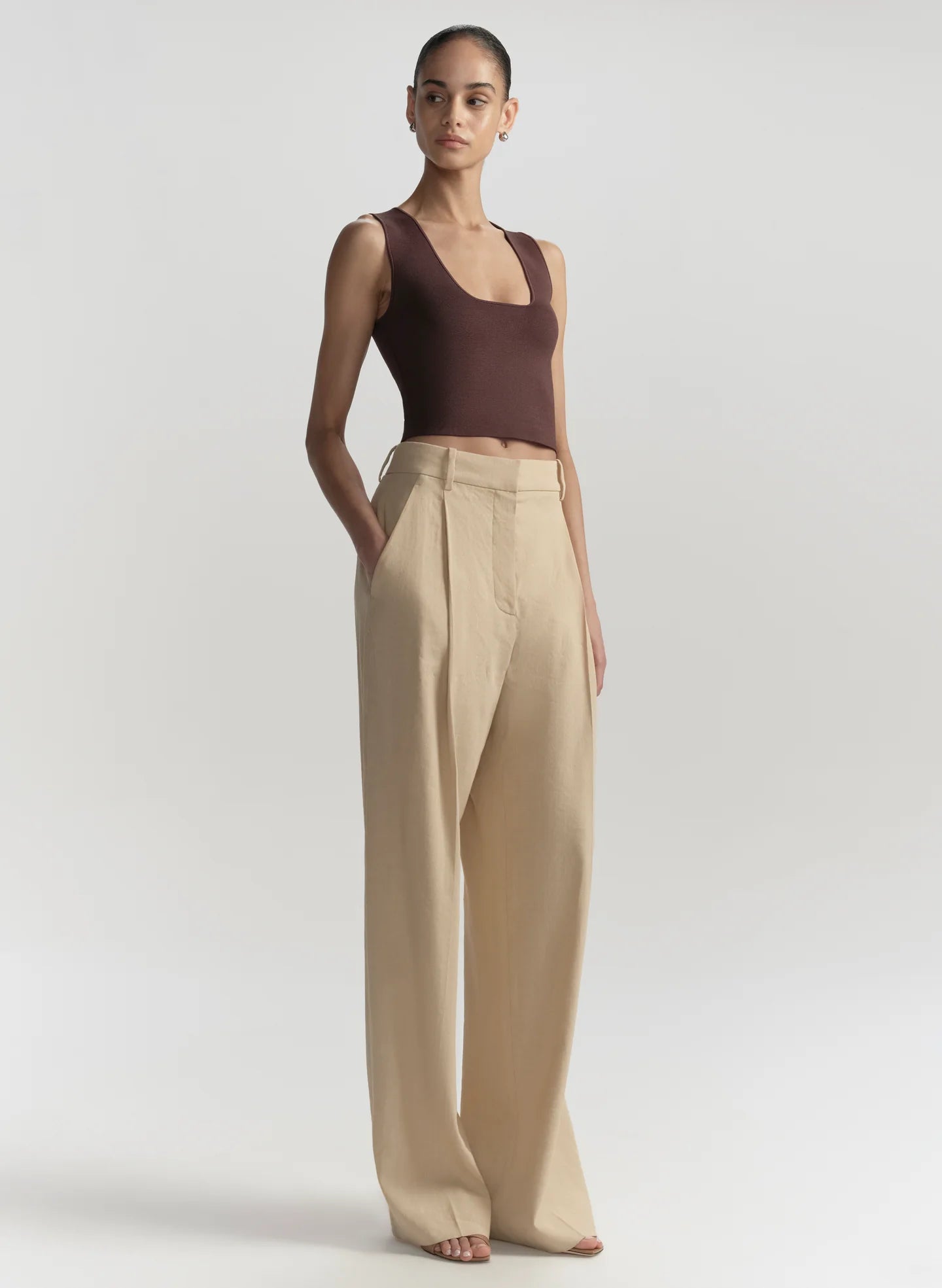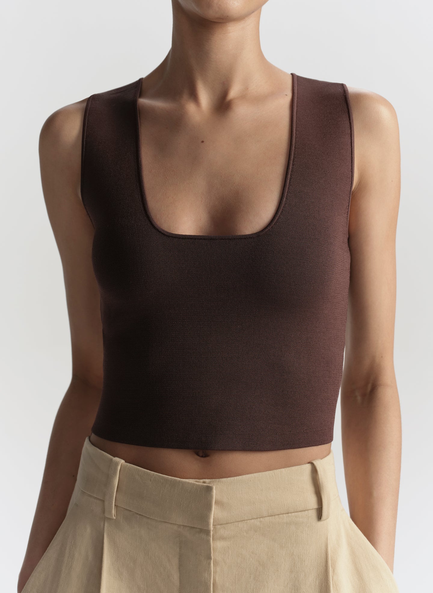The Sera Top is crafted from our signature compact rayon with a subtle sheen. This sleeveless cropped silhouette features a clean scoop neckline and a streamlined, body-skimming fit.