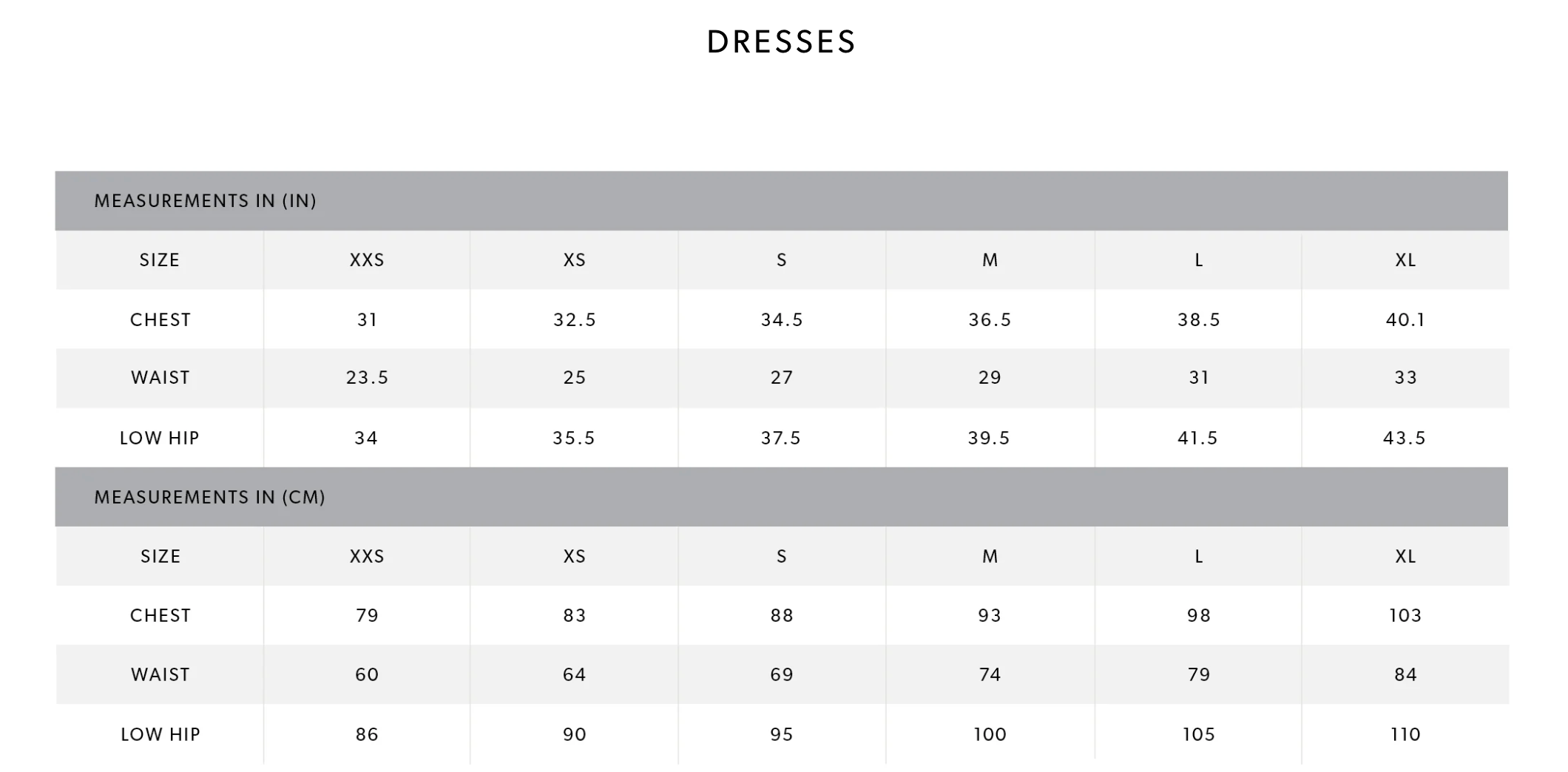 • Model Measurements: Height: 5'7.5", Bust: 32", Waist: 23.5", Hips: 34.5"
