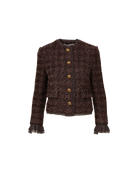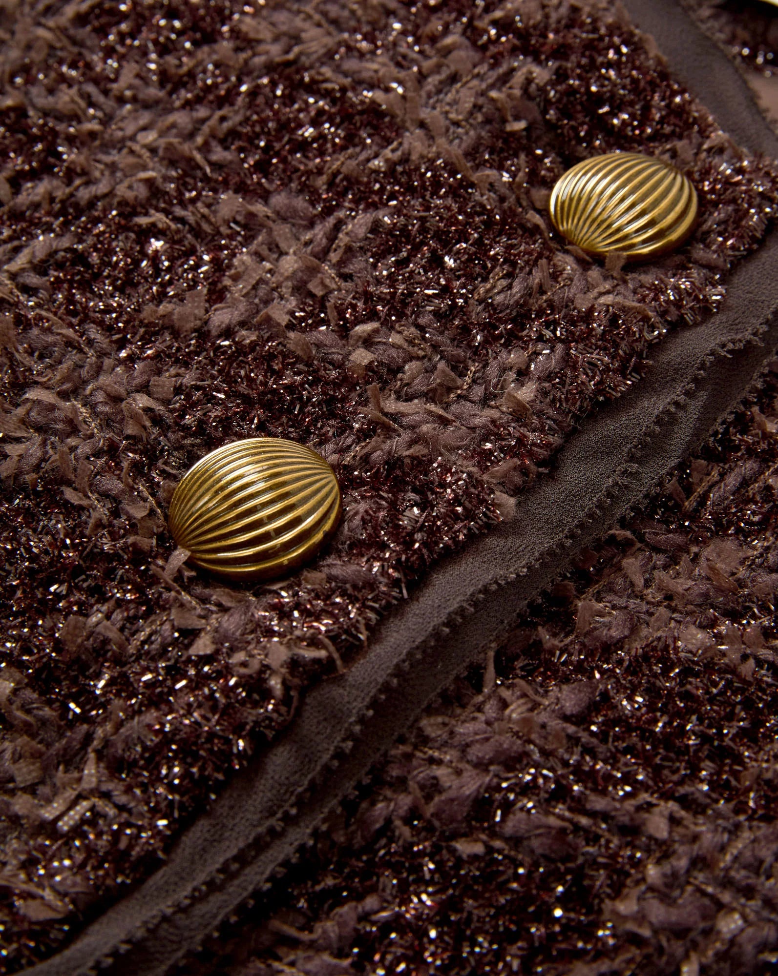 The classic lady jacket—with a high-shine twist. Crafted from maroon tweed with a metallic houndstooth pattern, the Audrina features a fitted, cropped silhouette and collarless neckline. A sheer trim and removable peekaboo ruffled cuffs add a touch of romance, while gold-ribbed buttons add a statement finish. Pair with corduroy jeans for everyday ease or a maxi skirt for a more polished look.