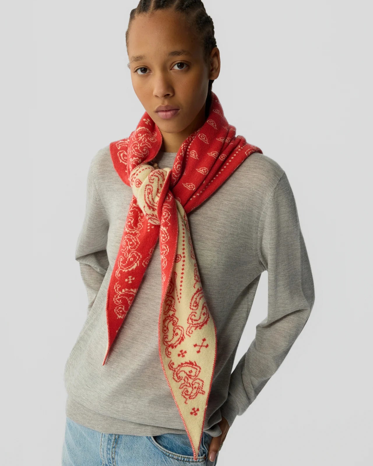 - Mid-weight cashmere bandana finished in our reversible paisley jacquard.