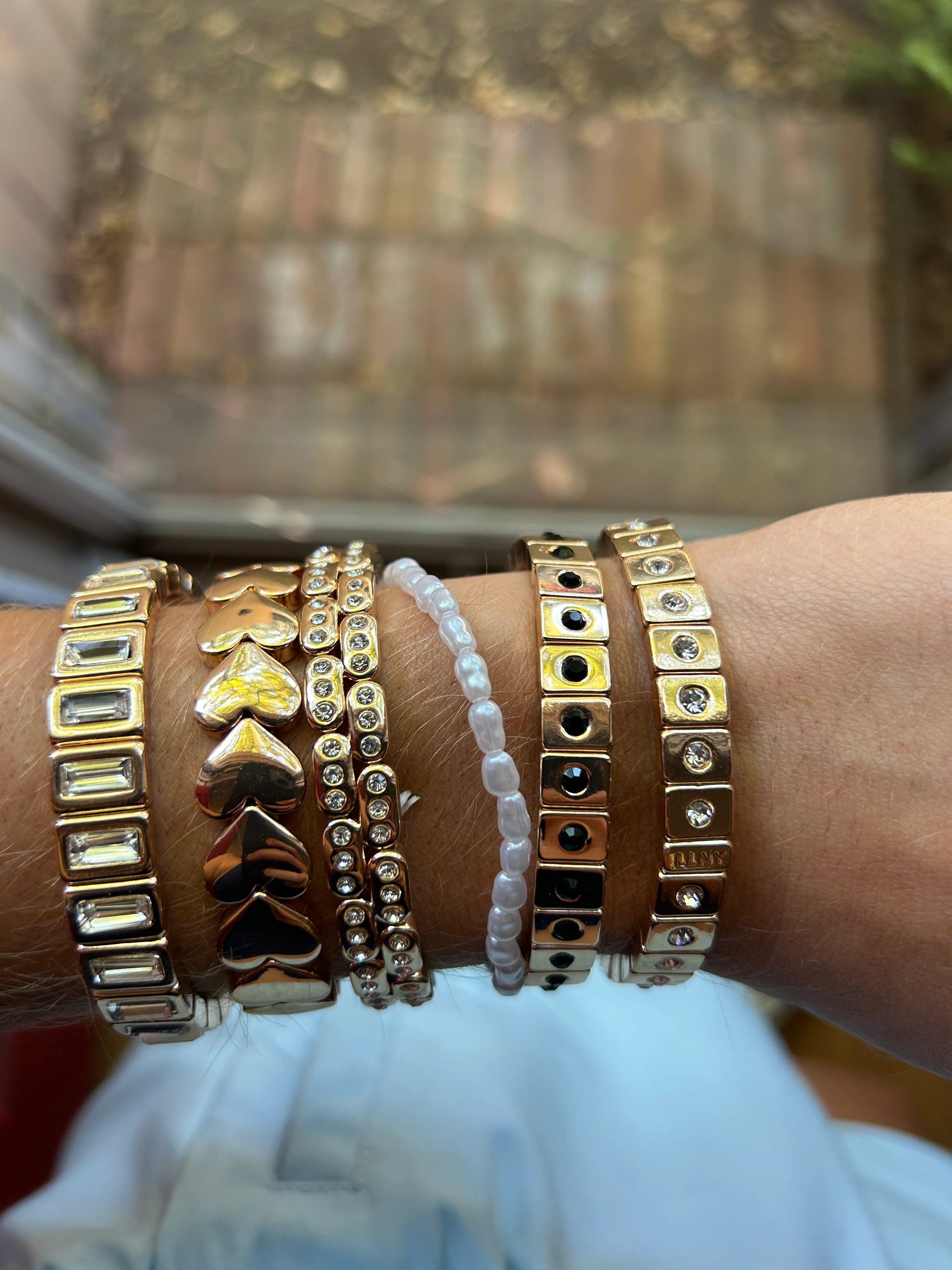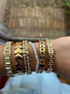 Our Little Ones Single Bracelet is hand-crafted using alternating gold and CZ beads. We carefully select each color pallet to strike a style for both everyday and special occasions. Part of our Fall Collection, this bracelet is 7" in length, 7MM bead diameter and is a slip-on-style. All of our single bracelets are designed to be stacked or they can be styled to wear alone.