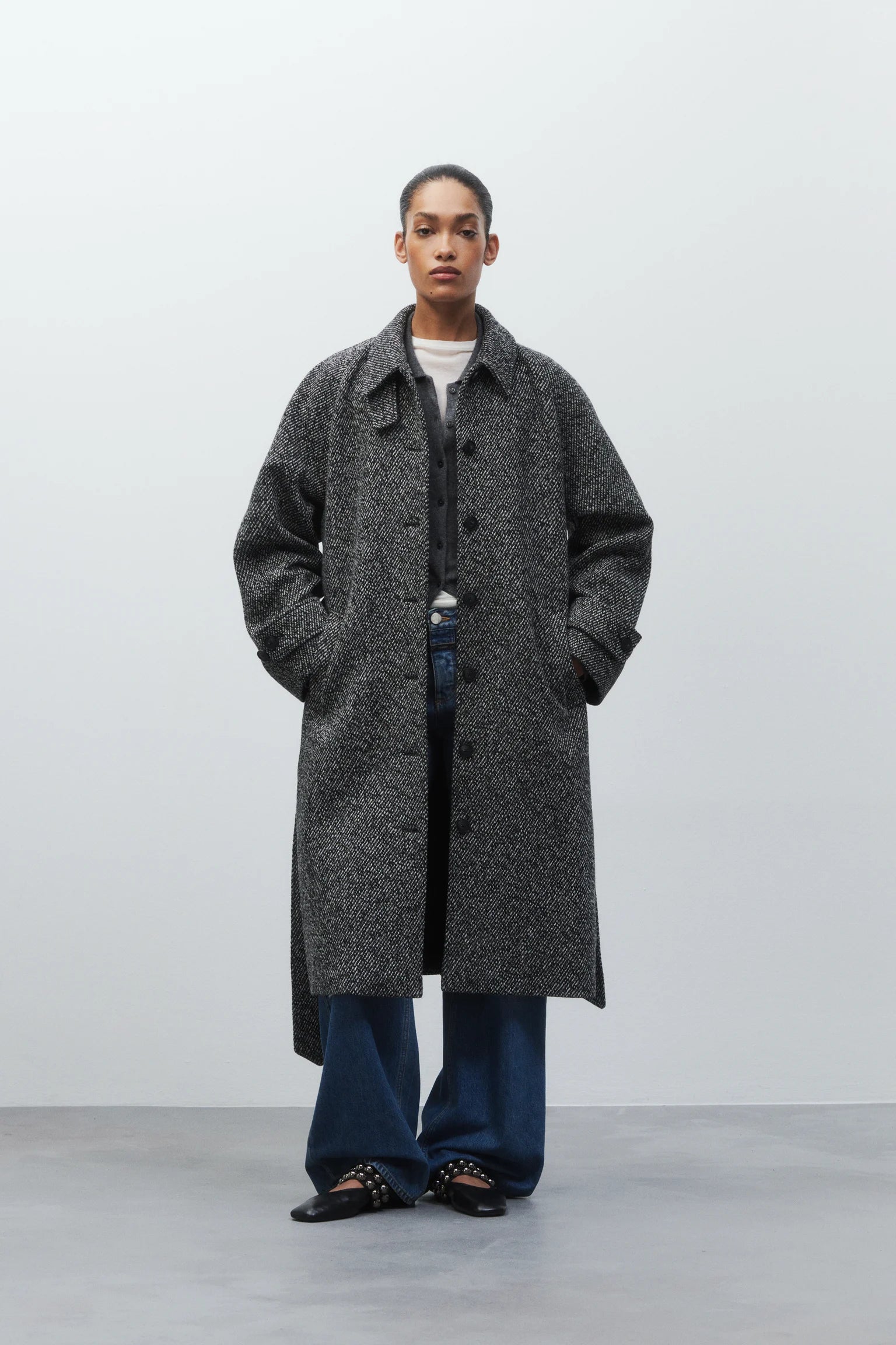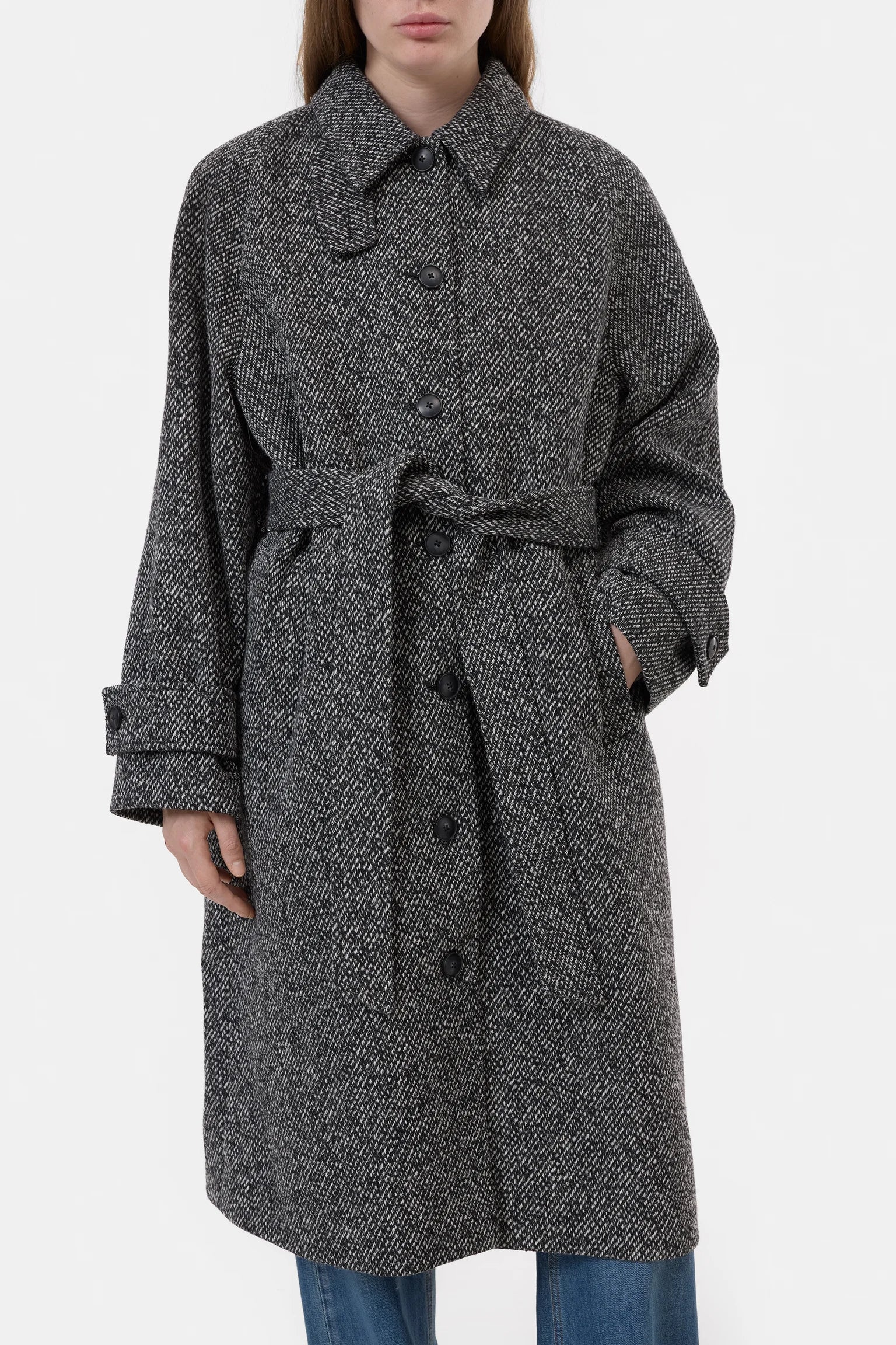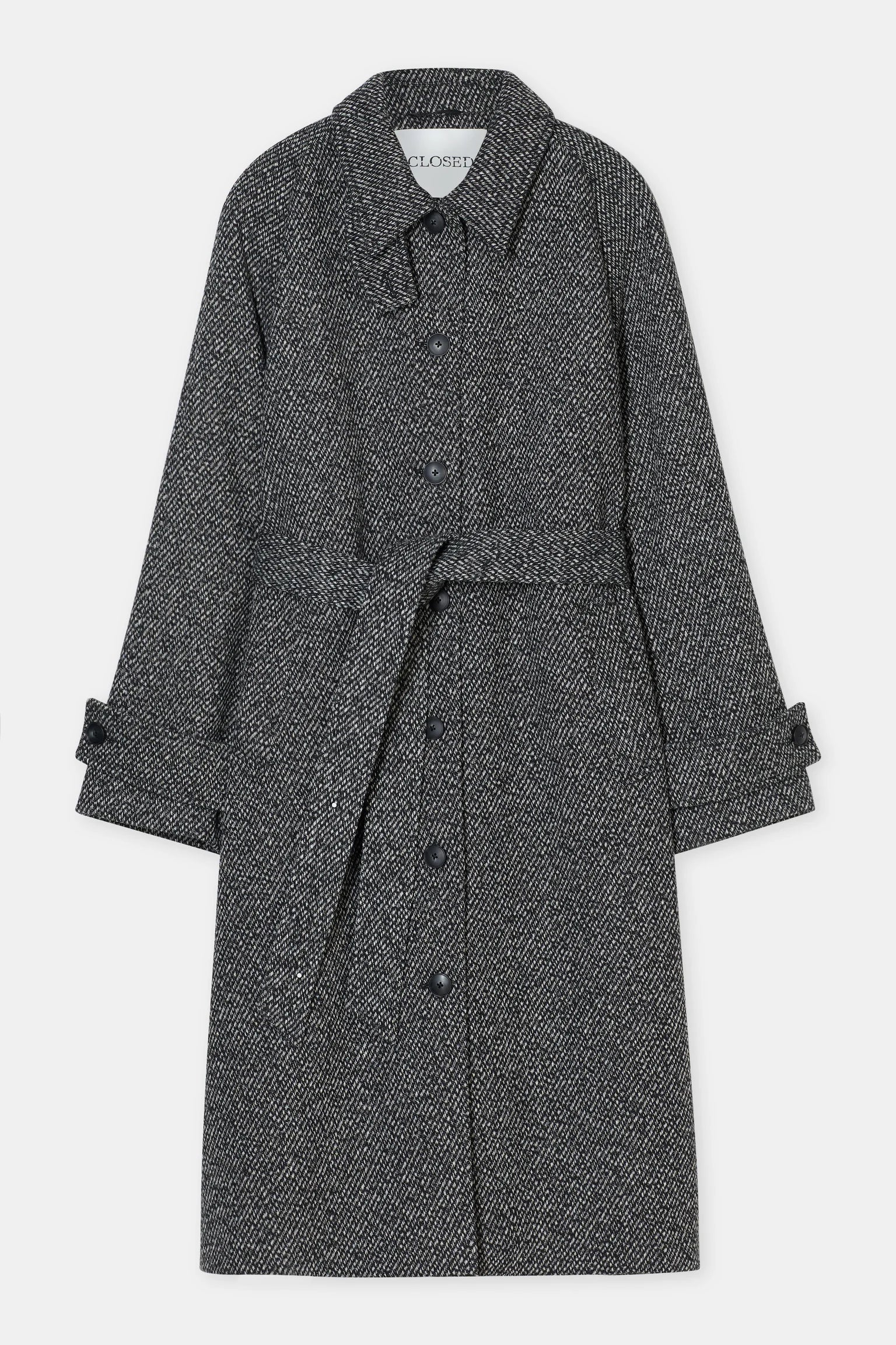 The belted coat features a regular fit with a generous length. Made from a wool-blend twill with two-tone mouliné yarns for subtle texture. The high-quality fabric contains 60% recycled wool. Details include a collar tab, raglan sleeves, adjustable cuffs, a wide fabric belt and a viscose lining with an inside pocket. The coat carries a leather-look label with the Closed monogram at the back.