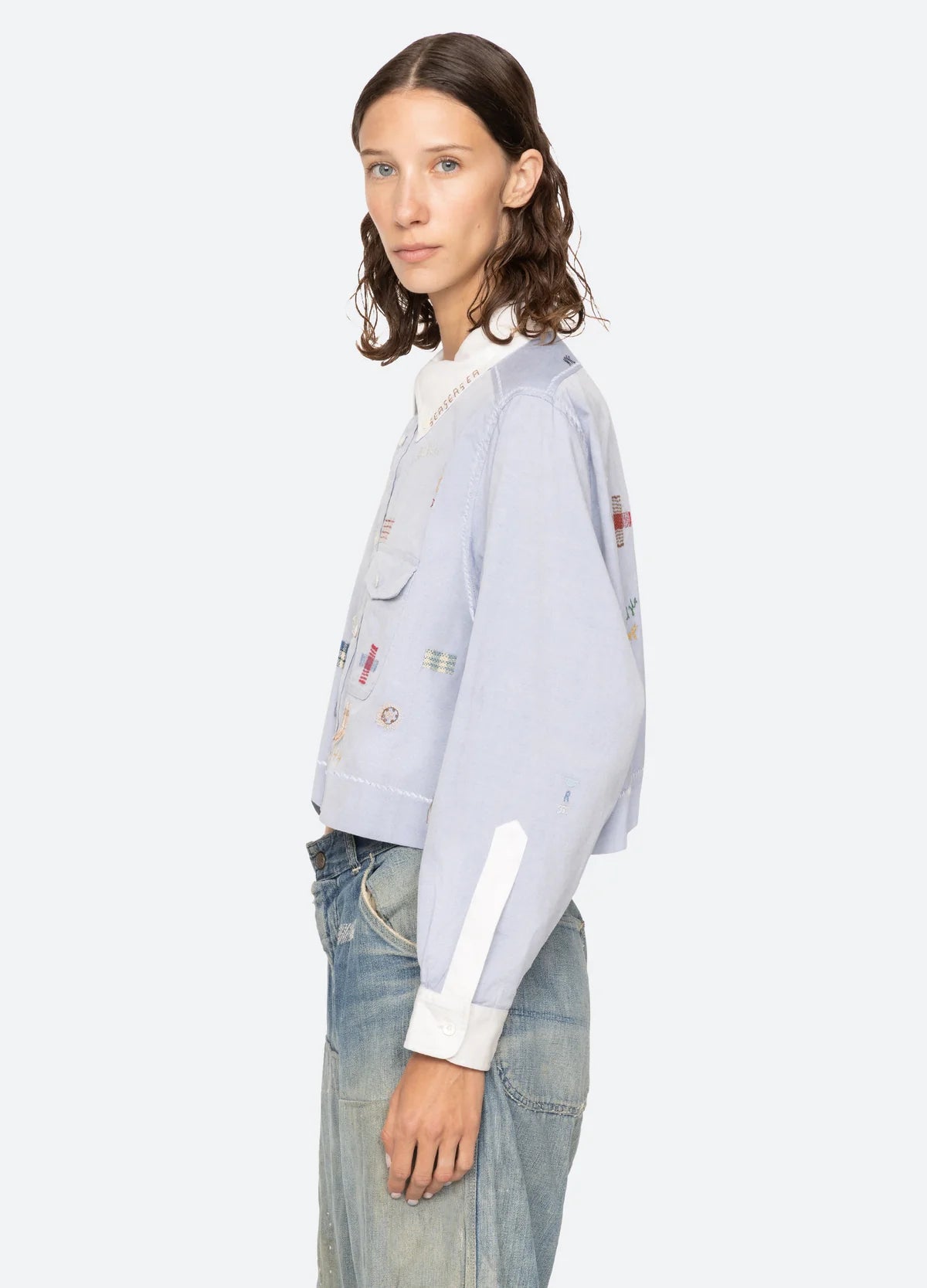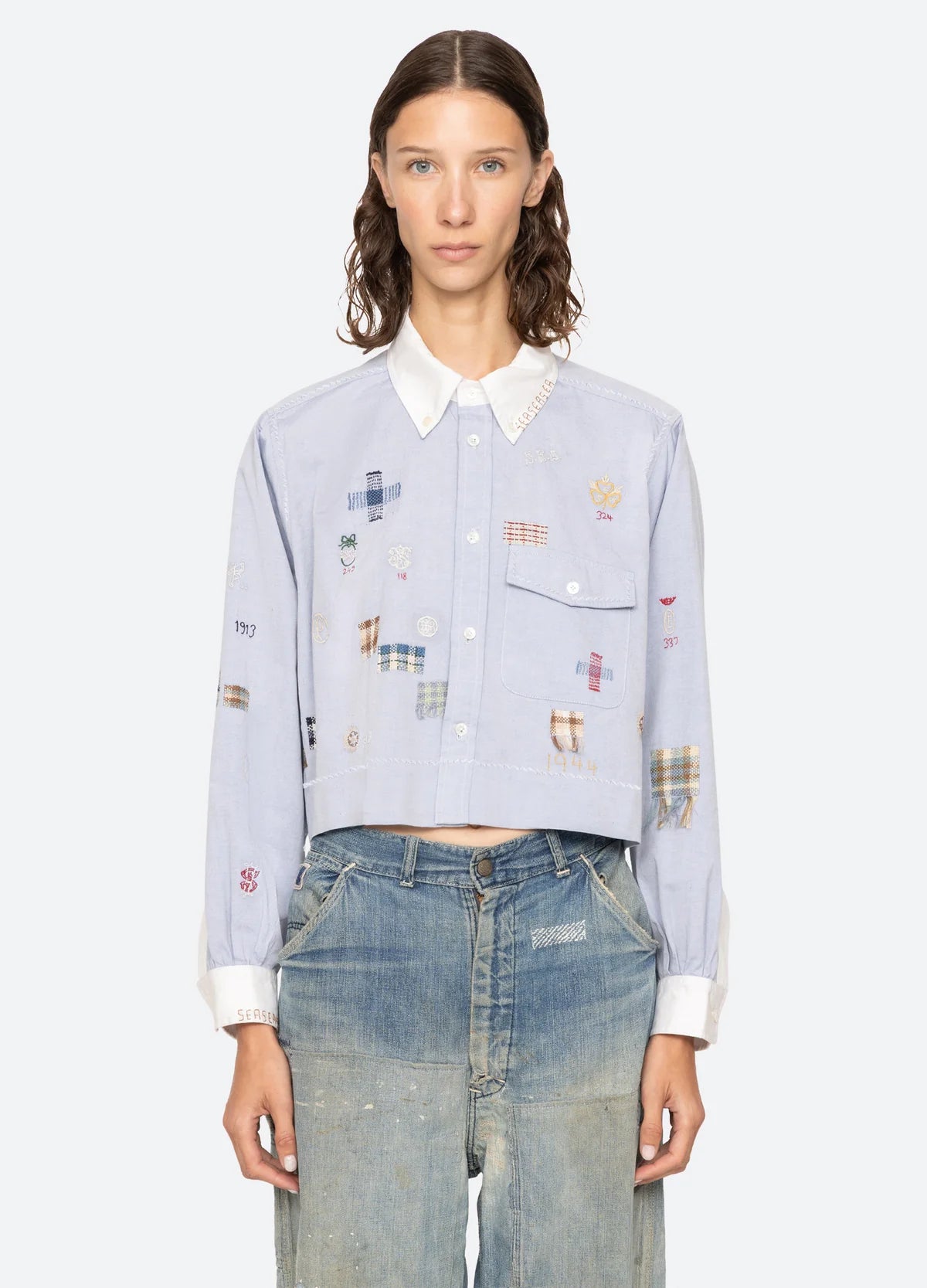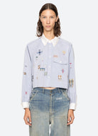 The Claira long sleeve shirt is a cropped oxford button-down with contrasting collar and cuffs. Detailed embroidery and mending lend a refined, crafted finish, making it an elevated staple.