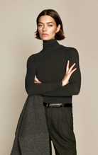 - Fitted turtleneck with long sleeves and center back seam detail.