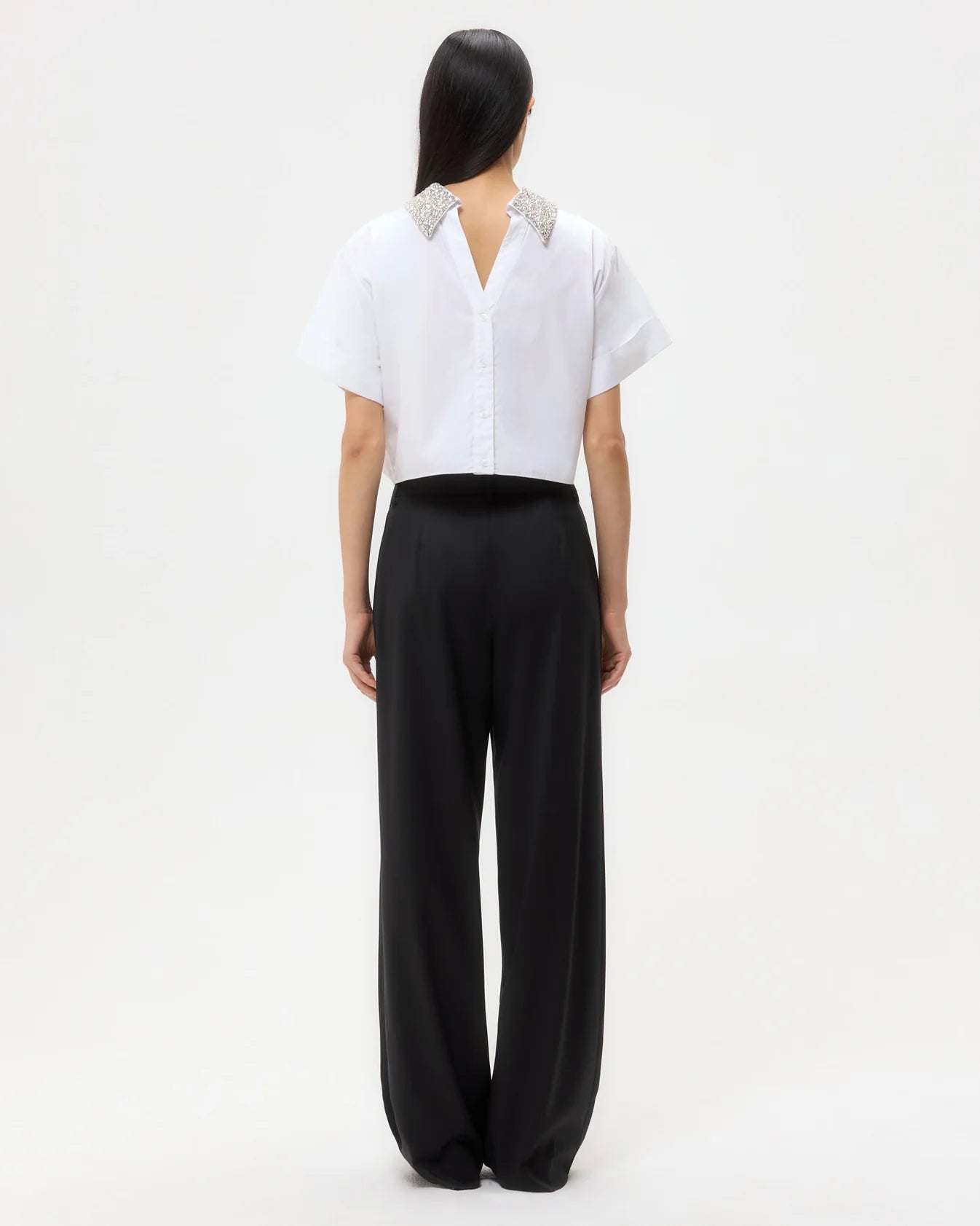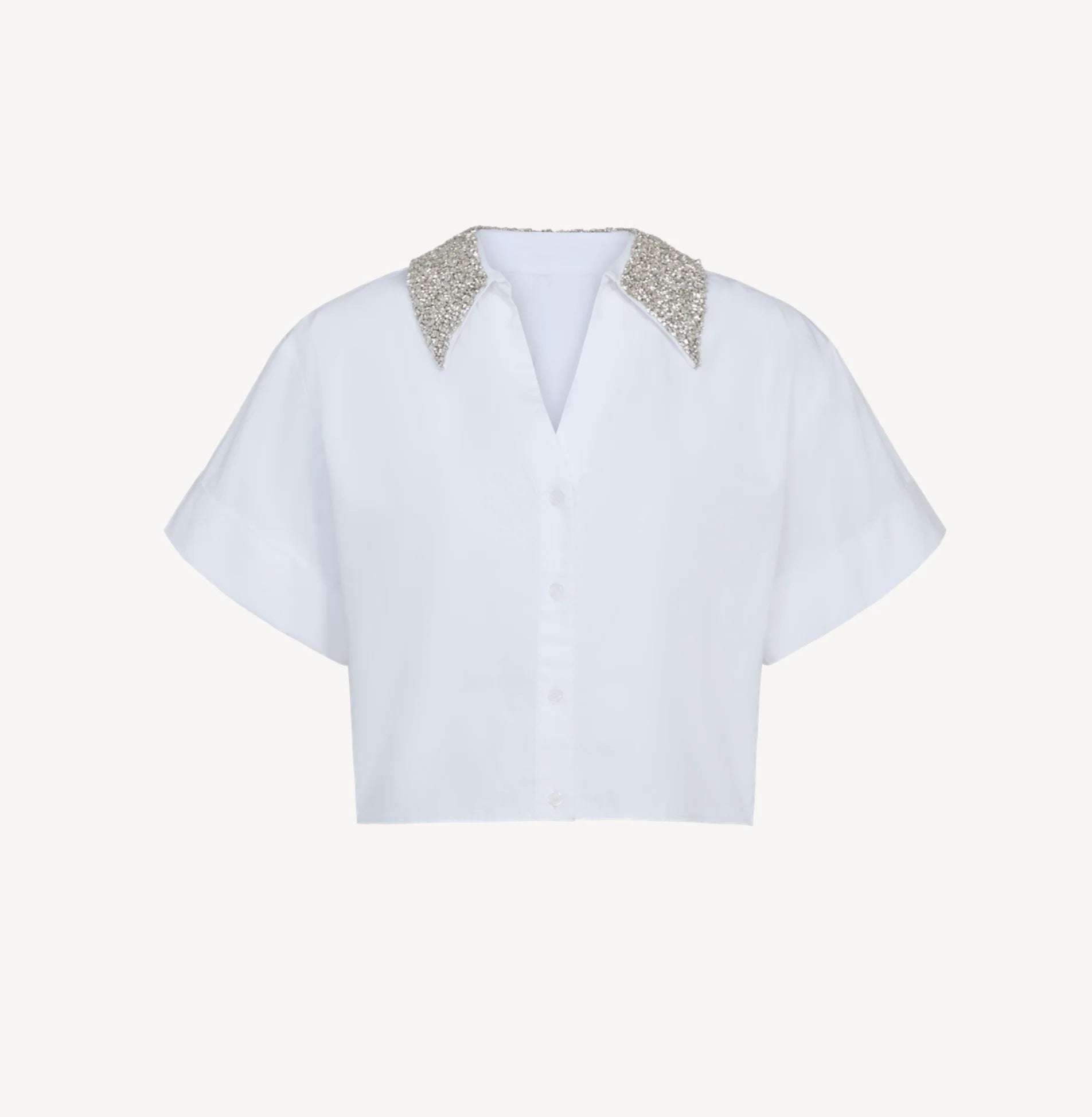 Cropped, reversible shirt in cotton poplin embellished with a sparkling prong-set crystal collar. Fabric is lightweight with a smooth texture and crisp hand feel. The Forever and Always shirt has a relaxed fit. Complete with a wide neckline, open back with button closure, and the option to wear cinched at the waist or loose as a cropped button-down.