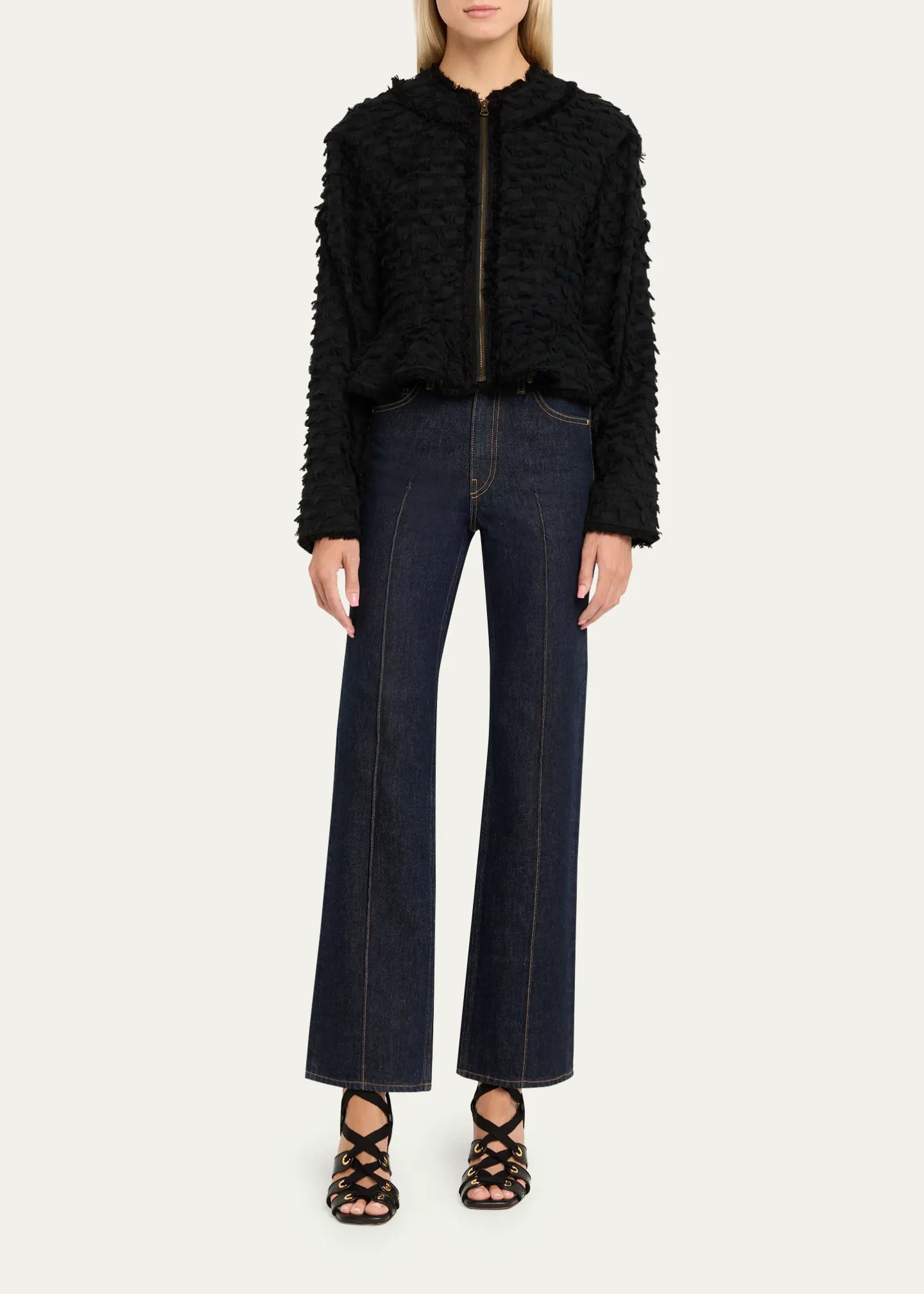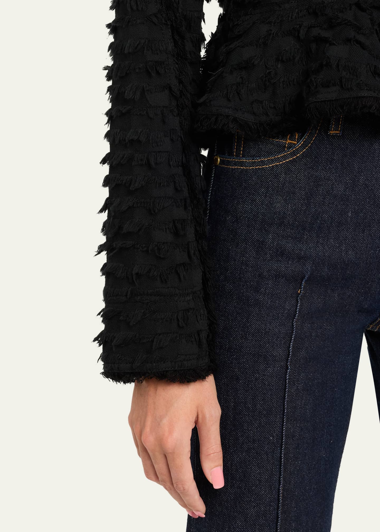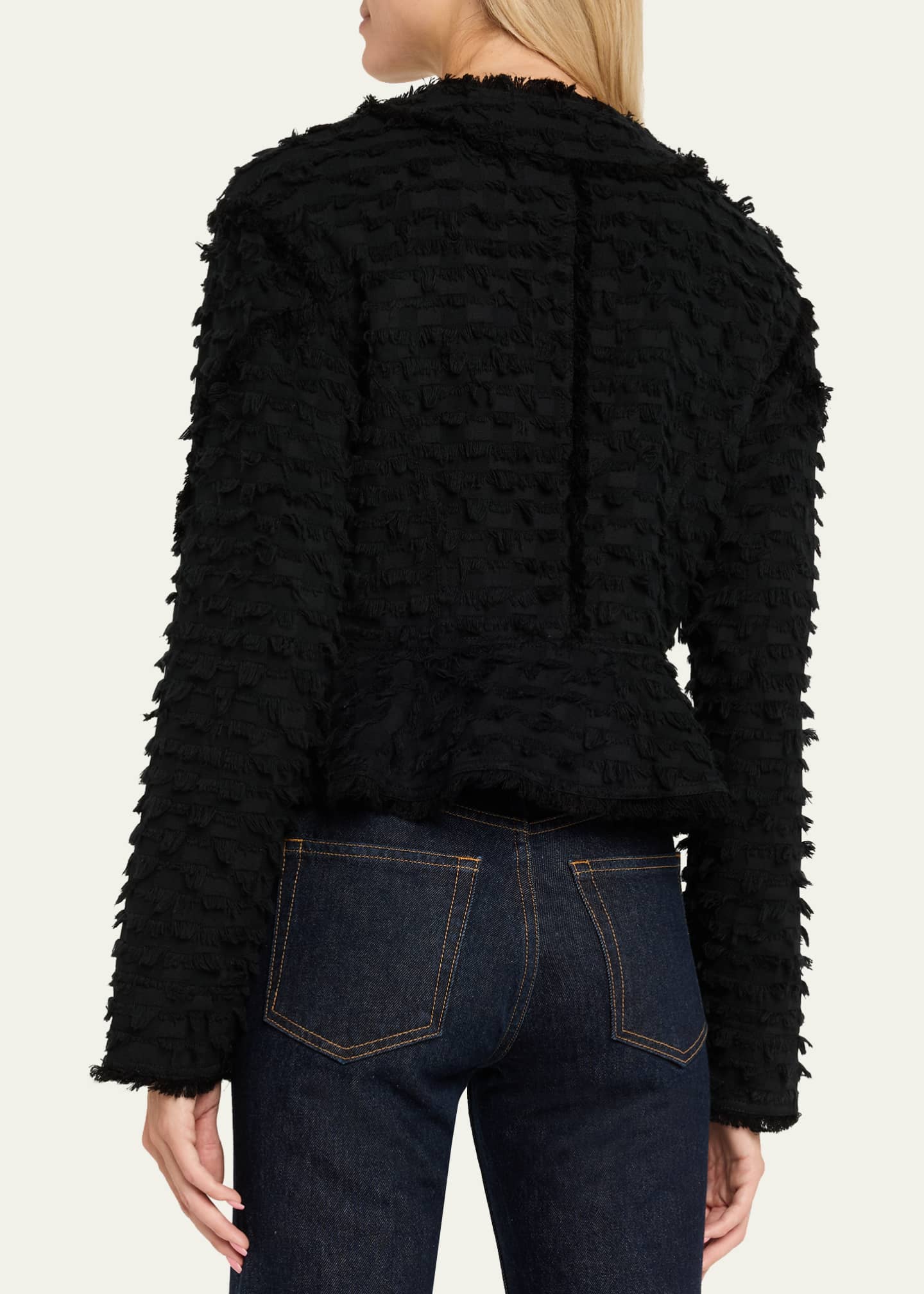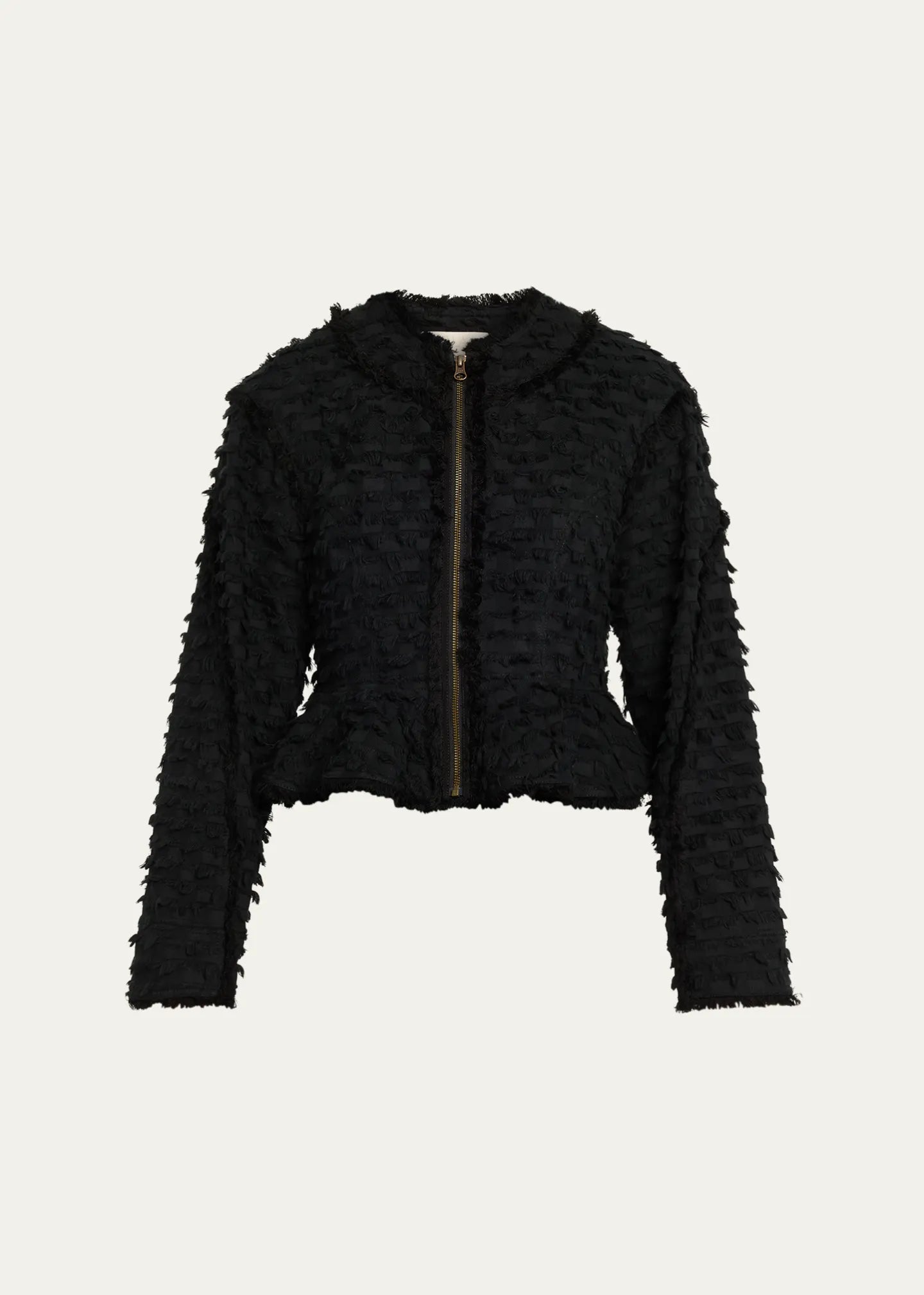 The Rosalind jacket from Ulla Johnson is crafted of cotton and features a frayed texture and a peplum hem.