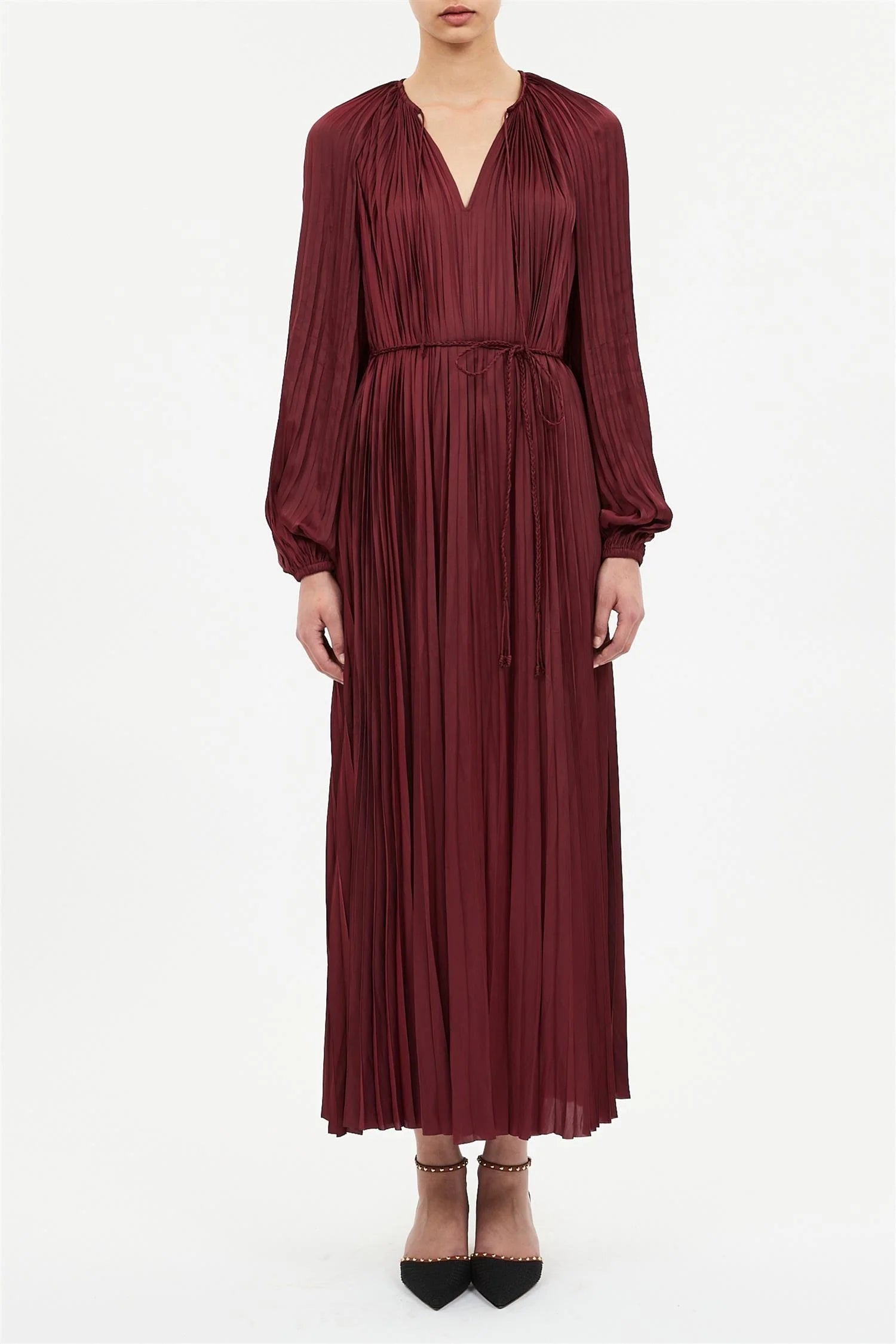 The Alexia Dress is tailored from smooth satin that’s gracefully pleated throughout. Enduring in elegance, this A-line red dress can be worn fluid and loose or with the belt for more definition.