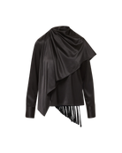 Easy elegance. The Daleney blouse is crafted from a premium silk blend and features a built-in scarf that drapes effortlessly over the shoulder, finished with tasseled ends for a hint of dimension and drama. Cuffed long sleeves and a keyhole back button closure complete the look. Pair this black top it with black trousers for a sleek look—or denim for something more relaxed.