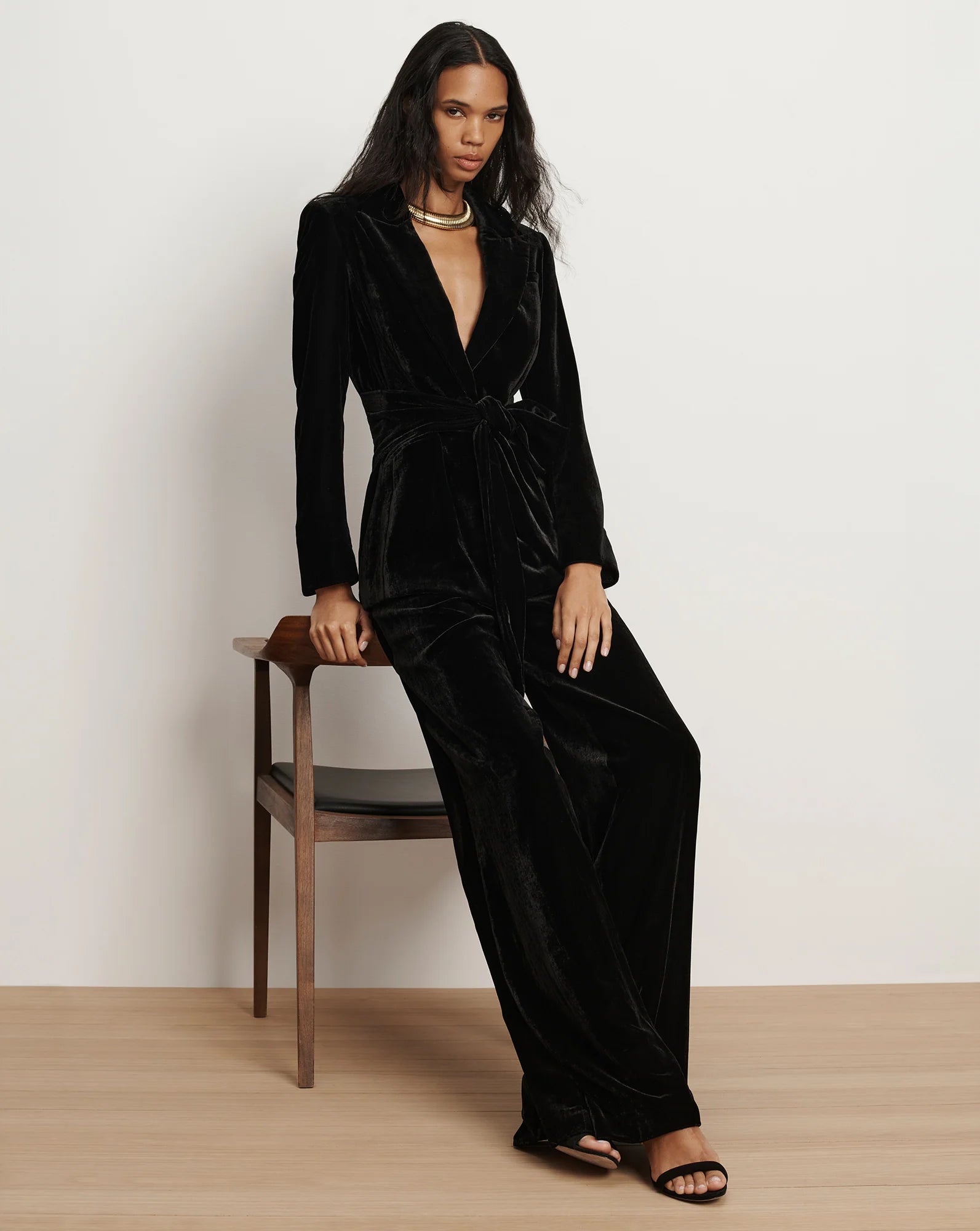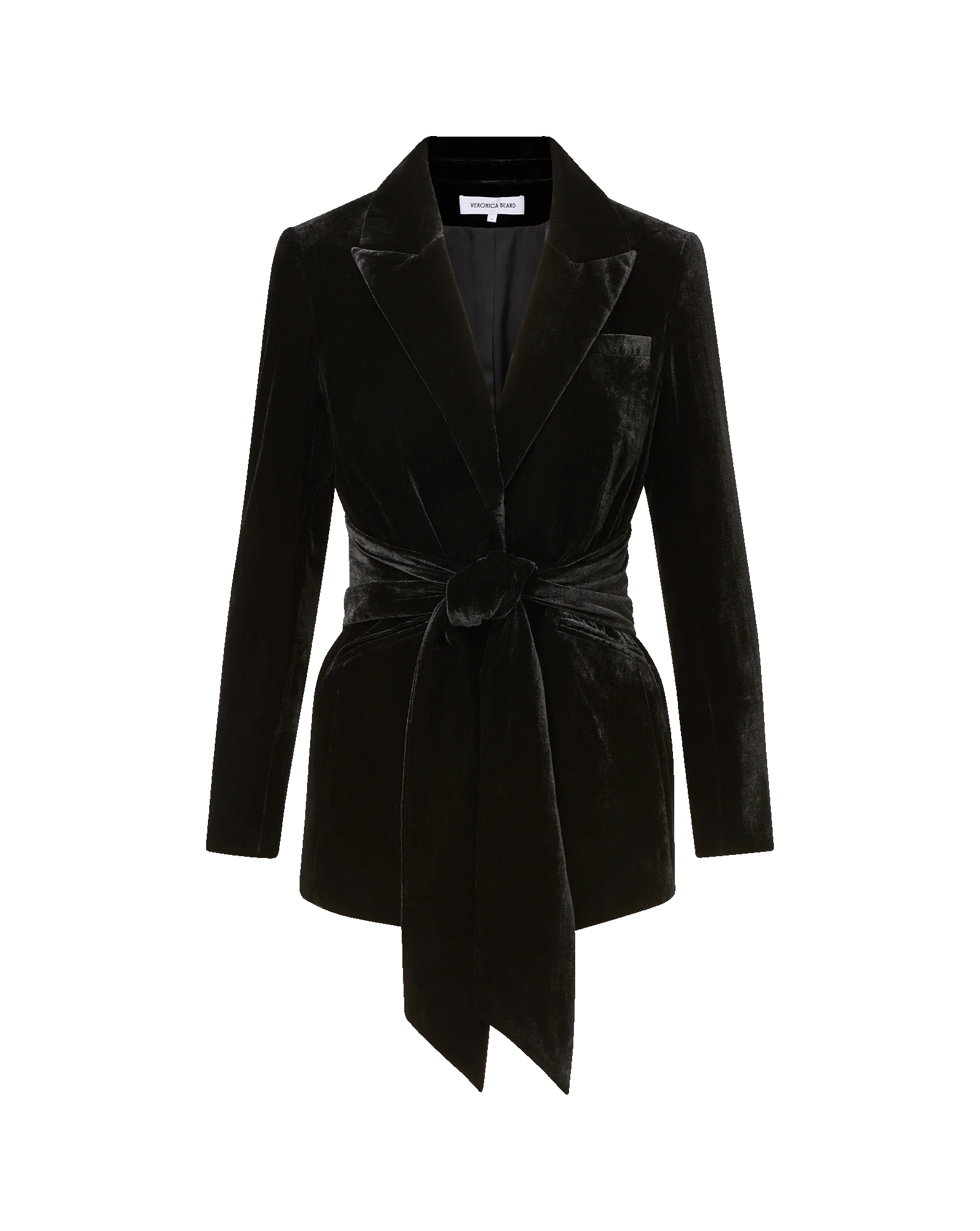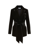 An elevated twist on the classic blazer. Crafted from luxurious black velvet, the Issel jacket features a relaxed, elongated silhouette and a wrap-style tie to cinch and define the waist. A peak lapel, chest welt pocket, and self-covered buttons at the front and sleeves enhance its clean, streamlined appeal. Perfect for event dressing, it pairs with the coordinating Alex pants for a chic tailored set.