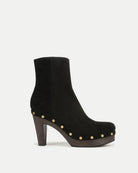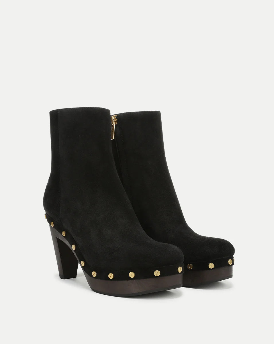 The boho clog—reimagined as a bootie. Crafted in sleek black suede, the Gavi ankle boot is set on a classic wooden sole with a chunky cone-shaped block heel, finished with gold studs along the base and a side zipper for ease. These platform boots pair effortlessly with everything from wide-leg VB denim to flowing maxi dresses.