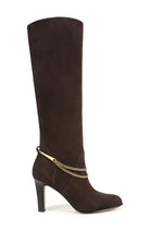 • Dainty (removable) chain links at the ankle add an elegant flourish to a knee-high boot shaped from smooth leather.