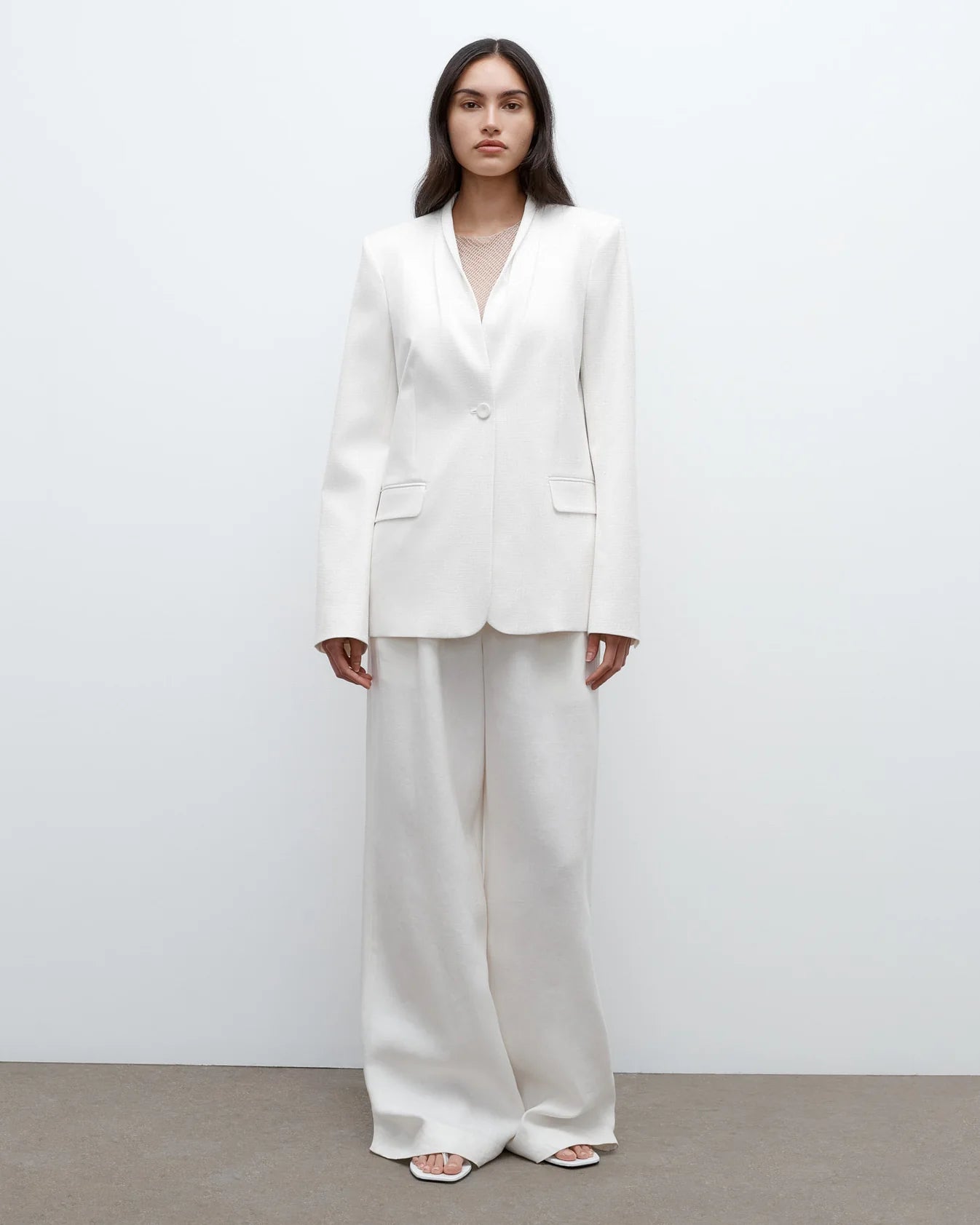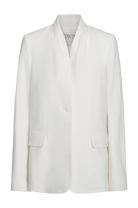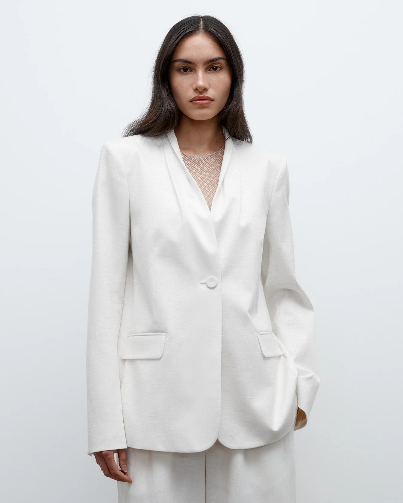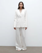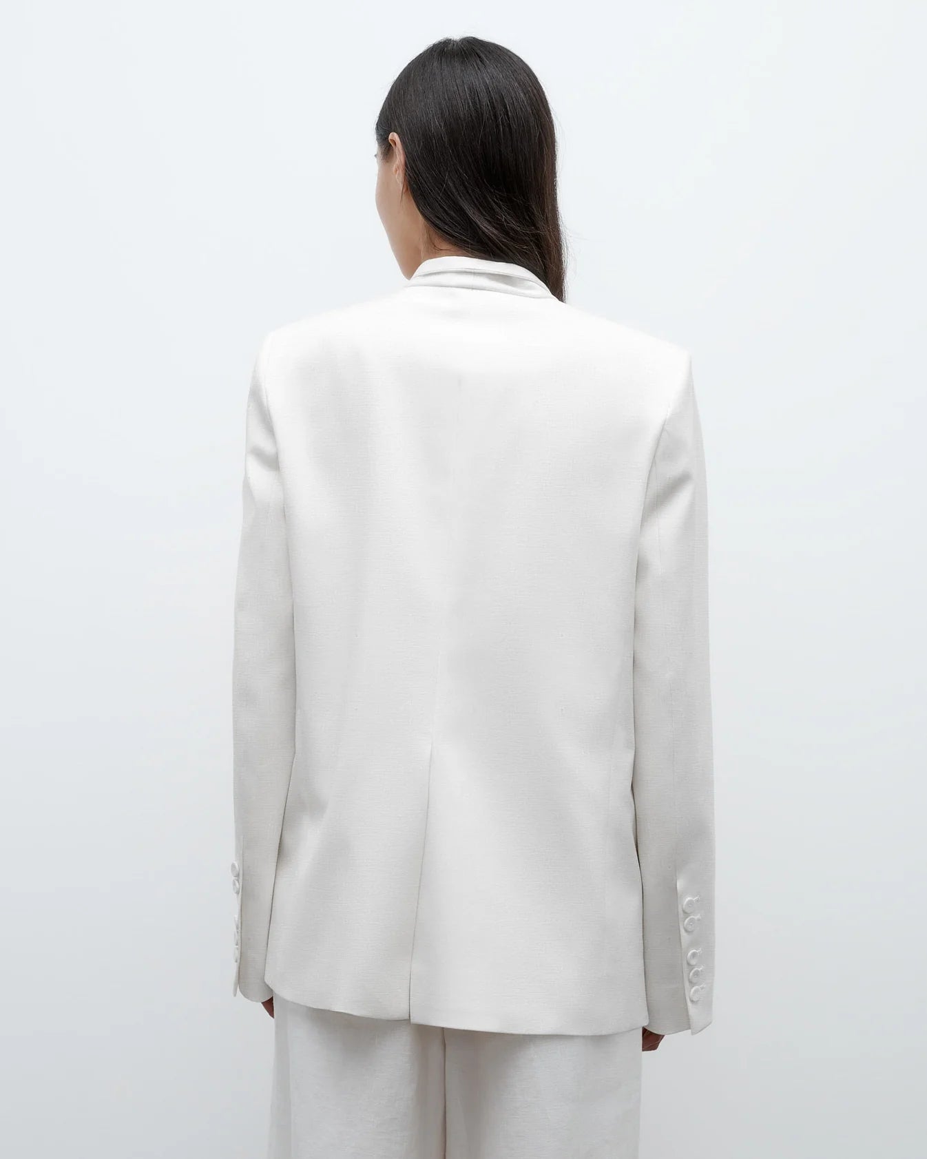 Oversized, collarless single breasted blazer in washed linen suiting. This fabric is made of 100% flax linen, with a washed finish and soft touch. The New Dinner Jacket is a one-button blazer which drapes over the hips. Tailored with side darts, shoulder pads and pleats below the neckline. Complete with side flap pockets, single vent and button cuffs.