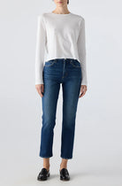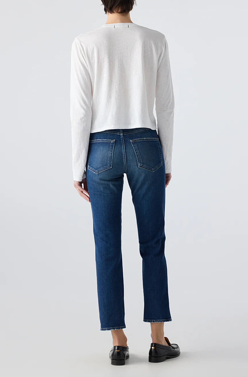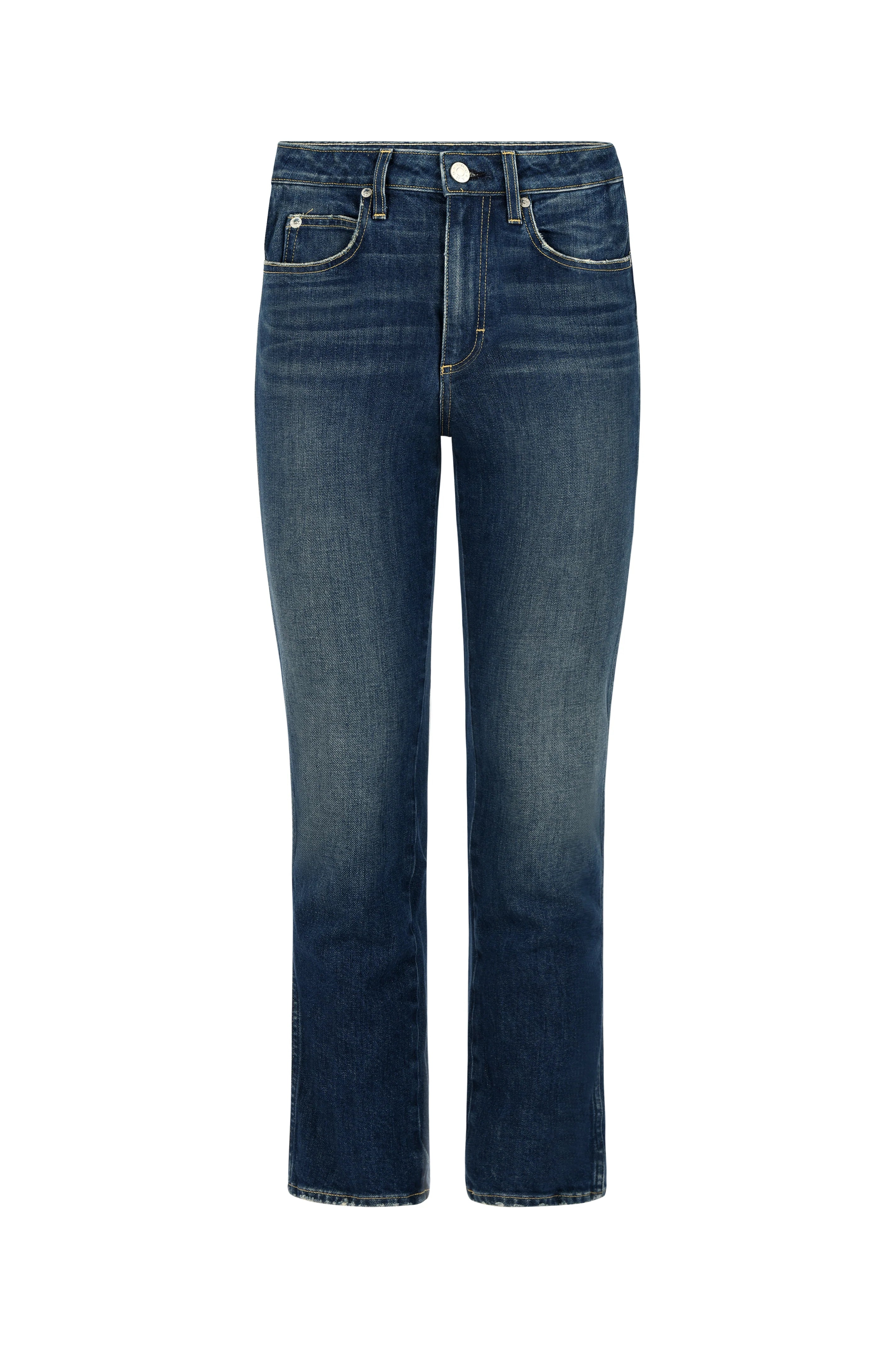 A high-rise, straight, cropped leg jean that hits just above the ankle is a wardrobe staple. Fitted throughout the waist, hips, and thighs with classic 5-pocket styling. Zip fly.