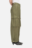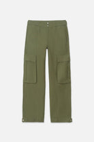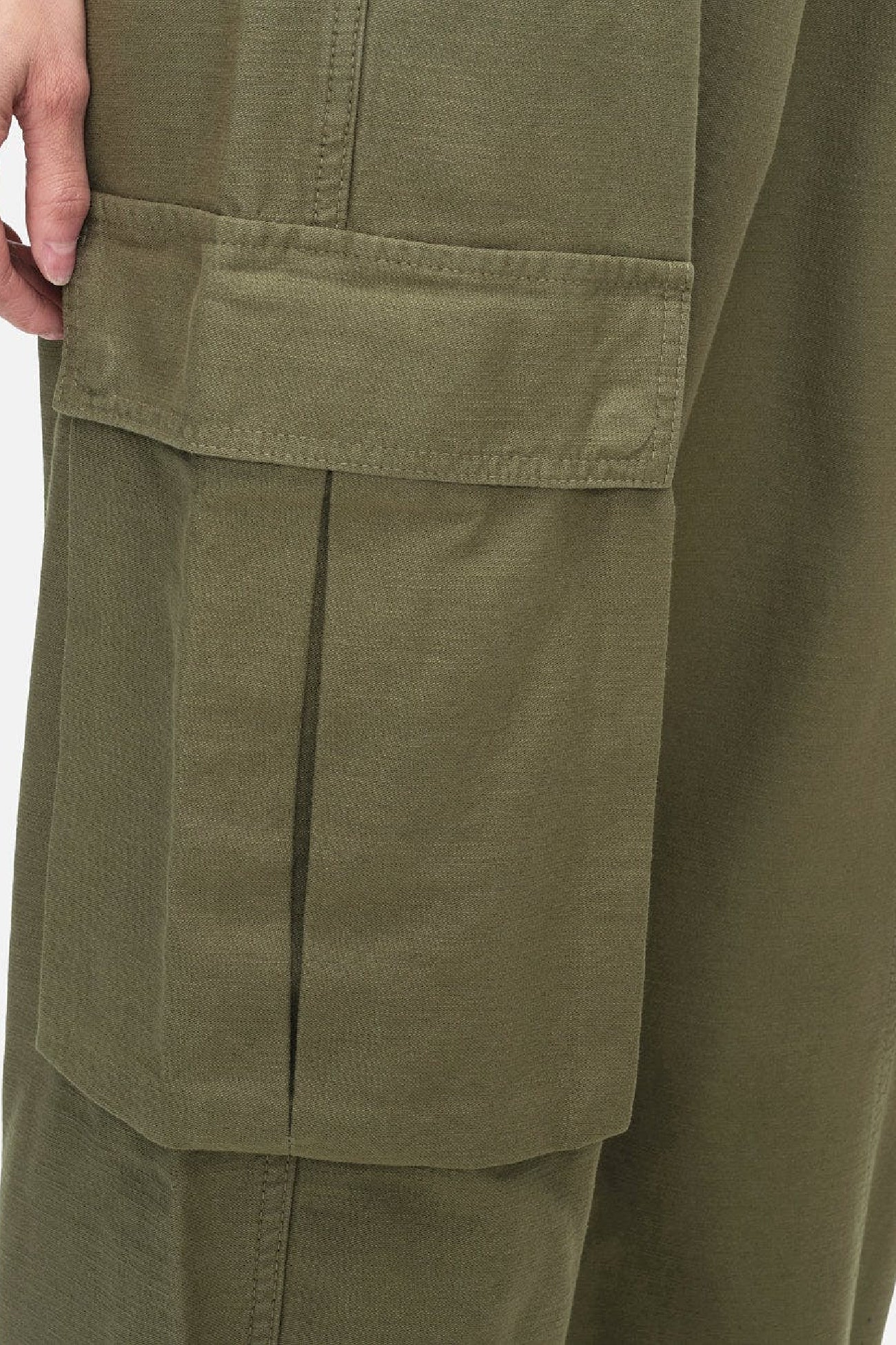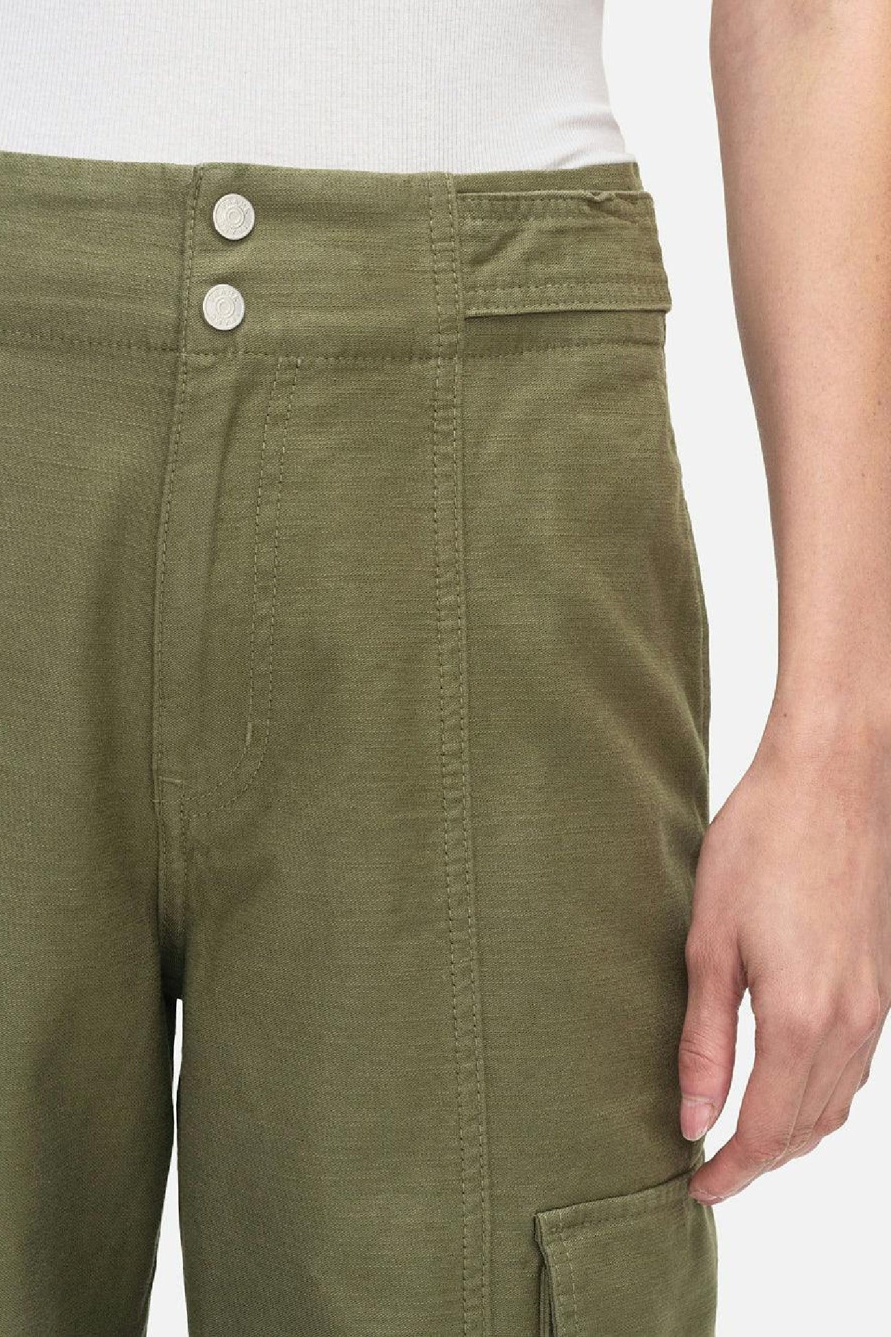 Designed with laid-back appeal, the Wide Leg Cargo pant is cut to a high-rise with an ankle length inseam. It features a double snap closure at the waistband, utlilitarian-inspired pockets, and a cinchable waist and hem with snap closures. Designed in an authentic, 100% cotton fabrication.