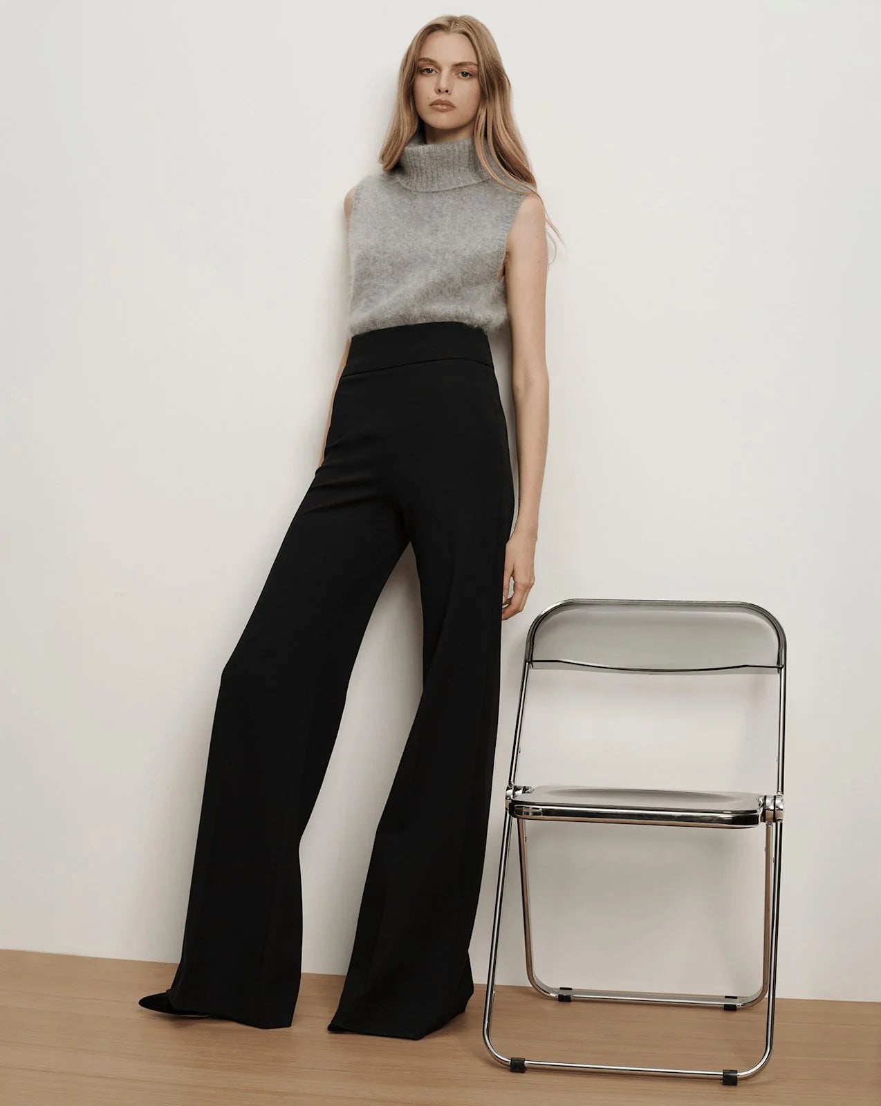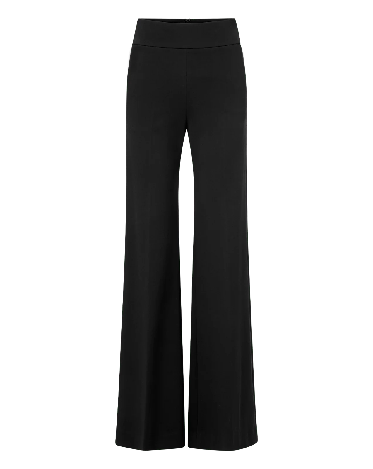 The ponte pant, perfected. Crafted from a smooth, stretch-viscose knit in black, the Kalinda features a super-wide-leg silhouette with a high, three-inch-wide waistband for a sleek, flattering fit. A pressed front crease adds polish and structure, while the invisible back zipper closure ensures a clean finish. Combining the ease of a pull-on pant with the refinement of tailoring, dress it up for work or down for the weekend.
