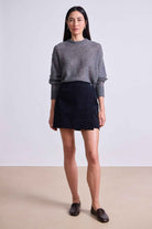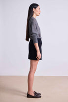 - Fitted silhouette, cross over flap with button closure, back welt pockets, side slits, mini length