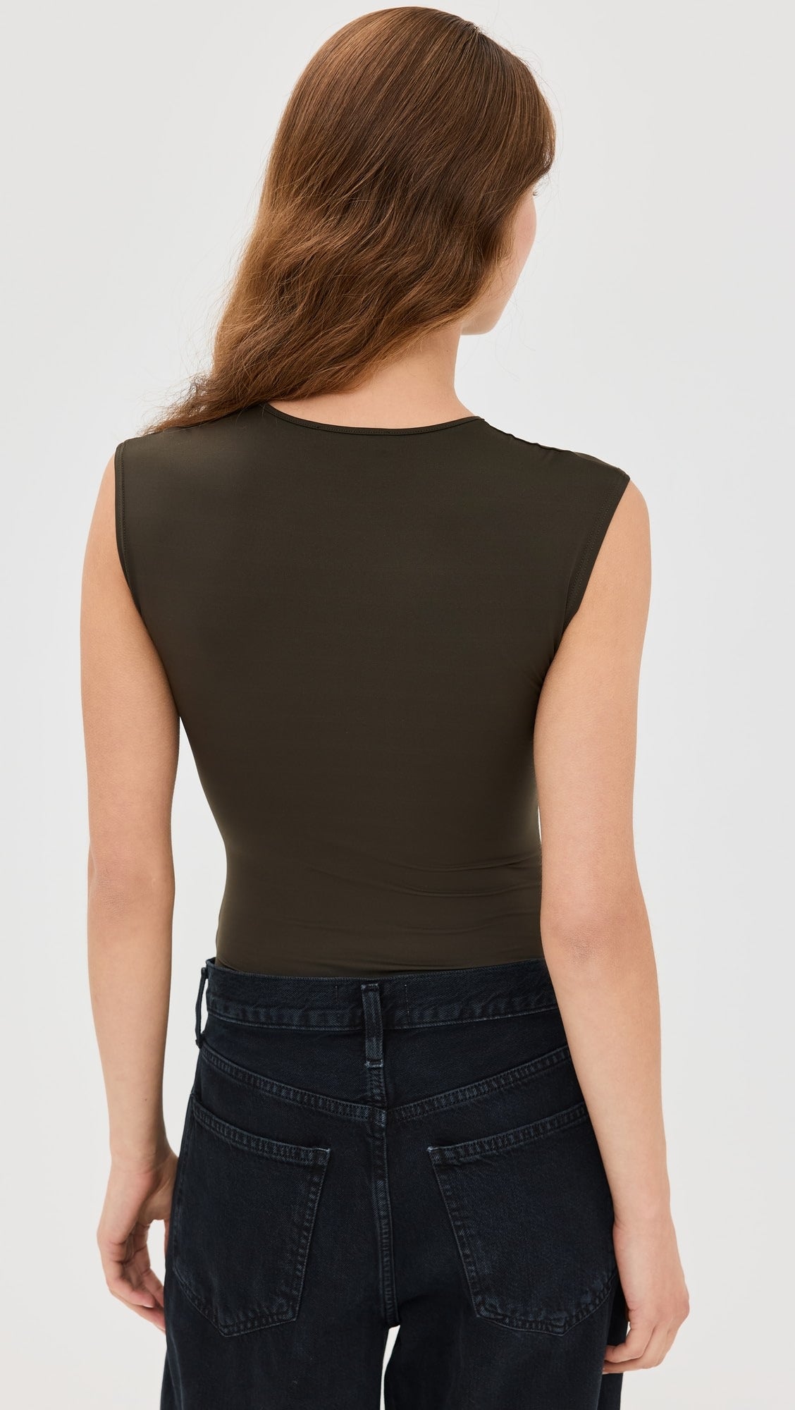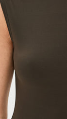 Looks Like: Dark brown sleeveless bodysuit with subtle sheen