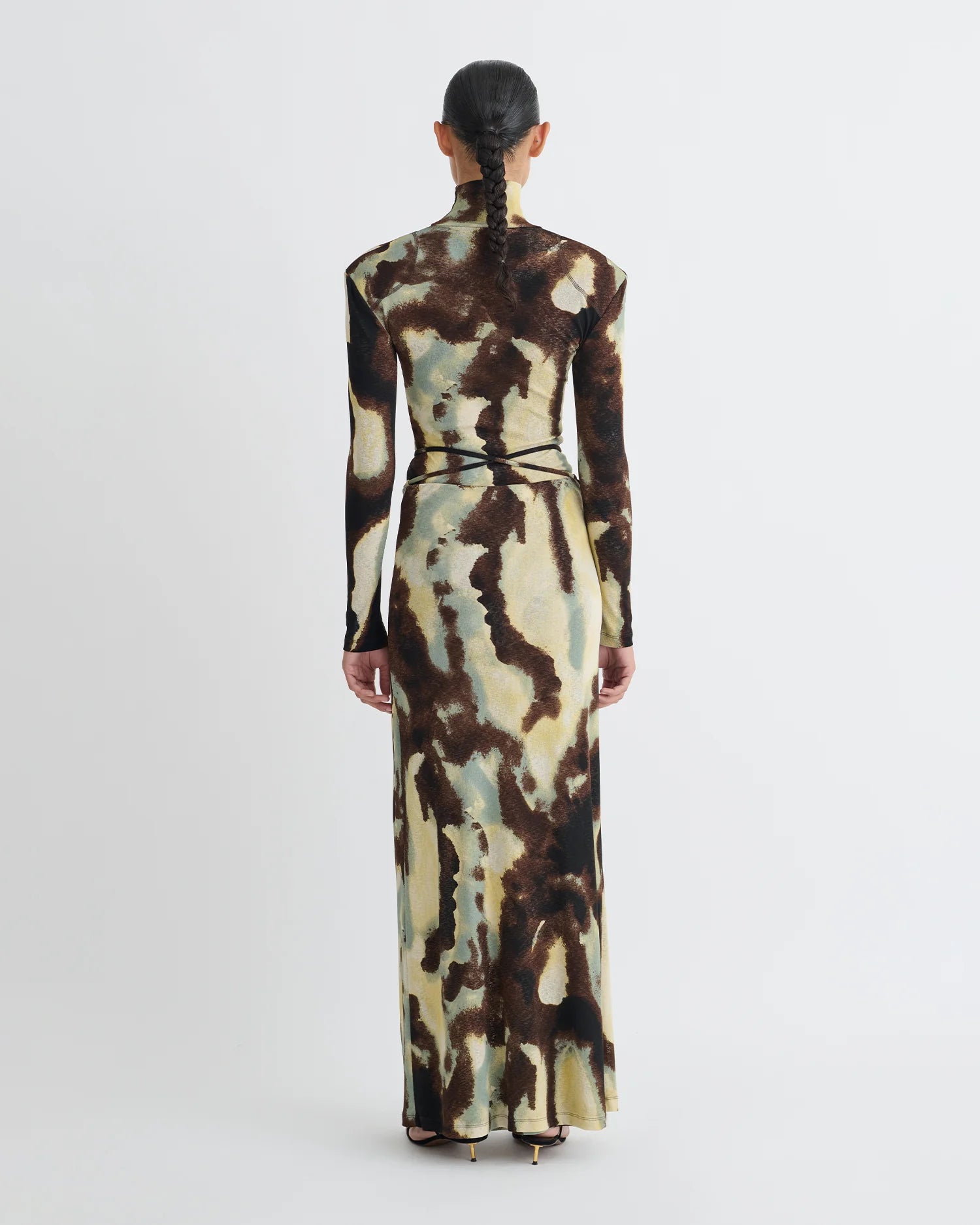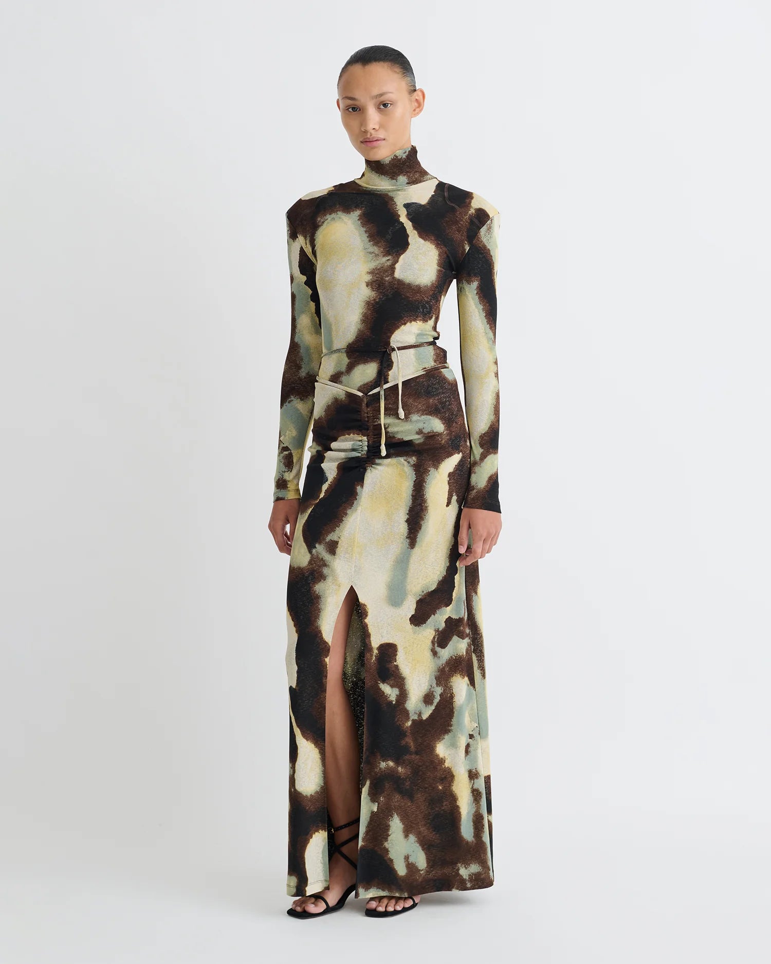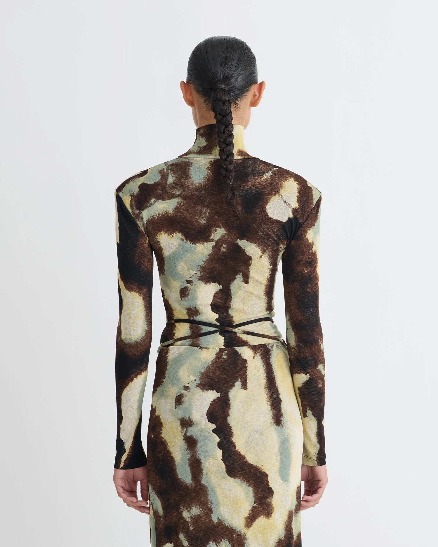 The Nayeli Top from Nanushka reimagines a classic turtleneck through the Fall-Winter 25 Grow collection’s lens of transformation. Crafted from delicate mesh jersey, its grown-on neckline and wide shoulders sculpt a modern, confident silhouette. Rendered in midnight mocha apricot, it offers a striking yet lightweight layer, designed to empower and evolve with the wearer’s shifting sense of self