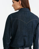 Classic, straight fit collared jean shirt in Japanese denim. Western details. Pearl snap buttons. Chest flap pockets. Standard placket. Center front buttons. Buttons at cuff.